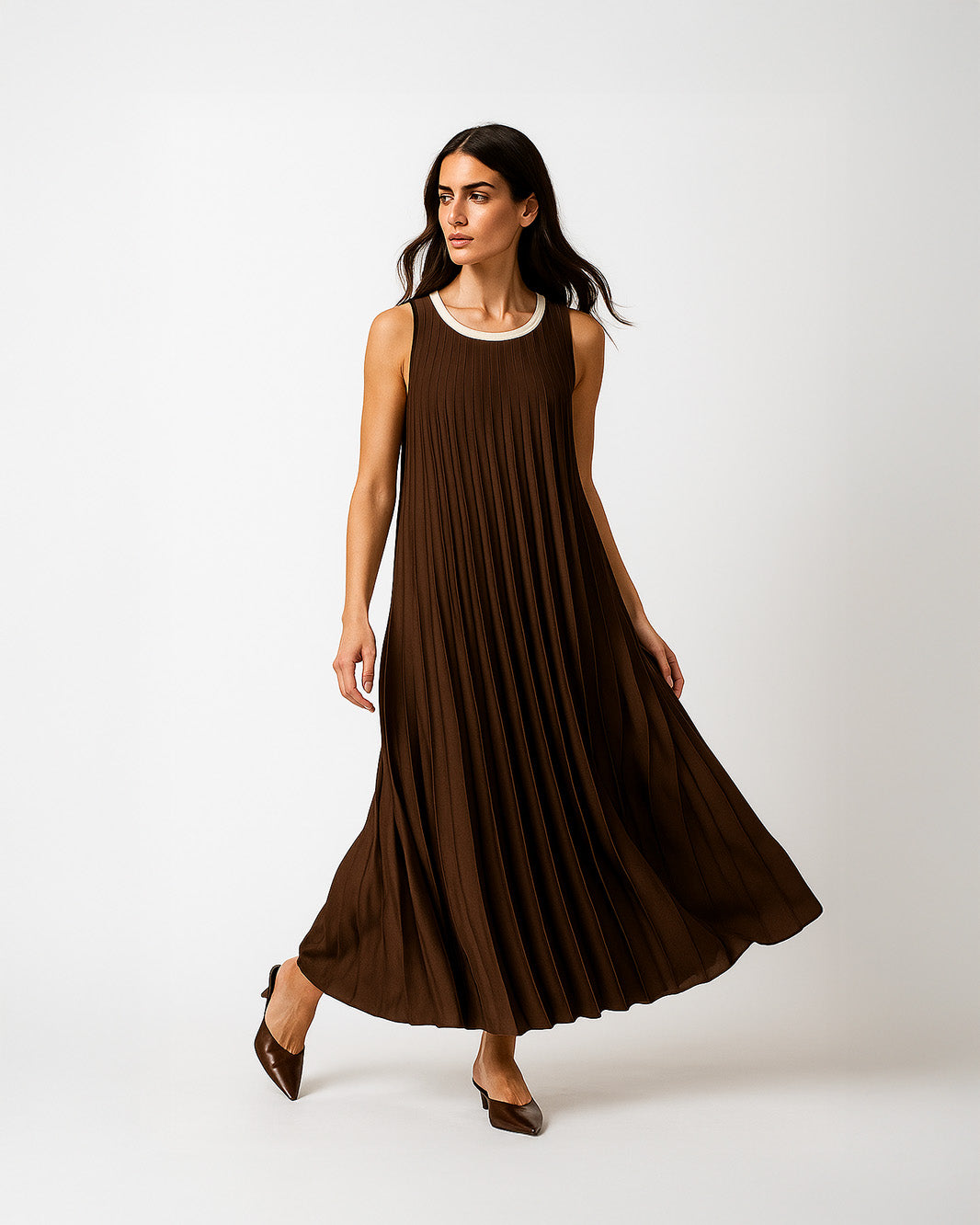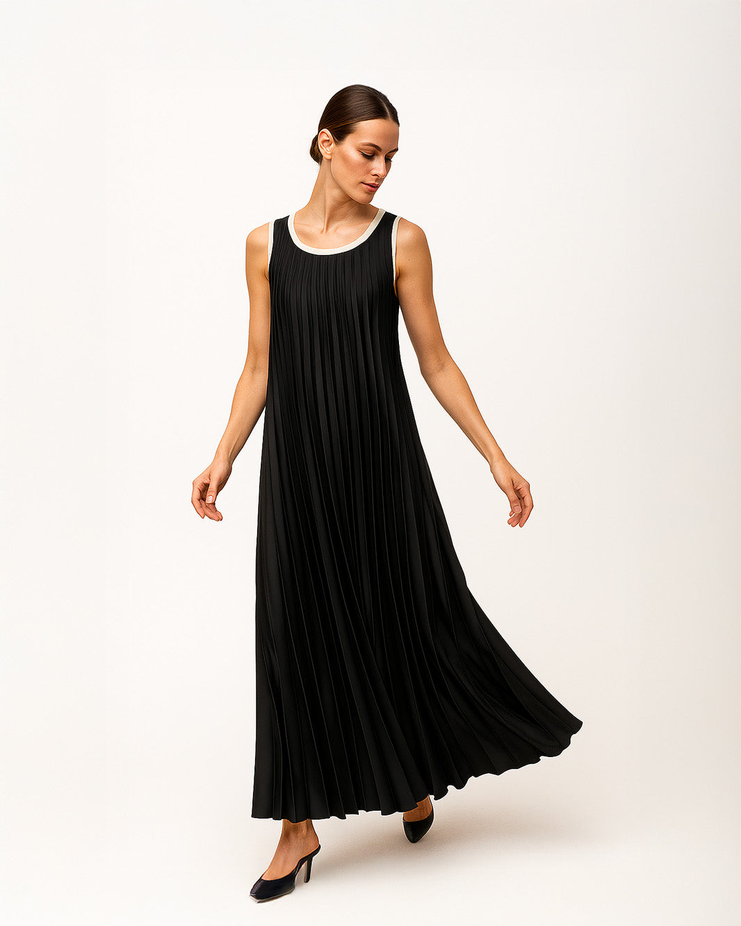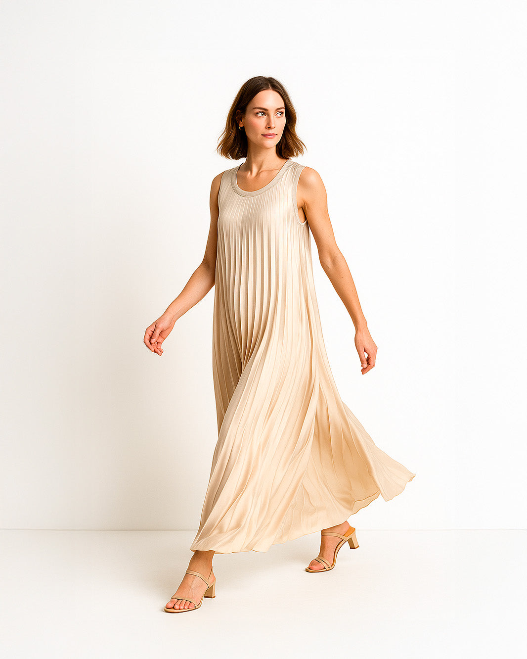 Abito lungo plissé senza maniche. Un modello elegante e leggero che scivola armoniosamente sul corpo, ideale per occasioni speciali o per look raffinati dal fascino senza tempo.