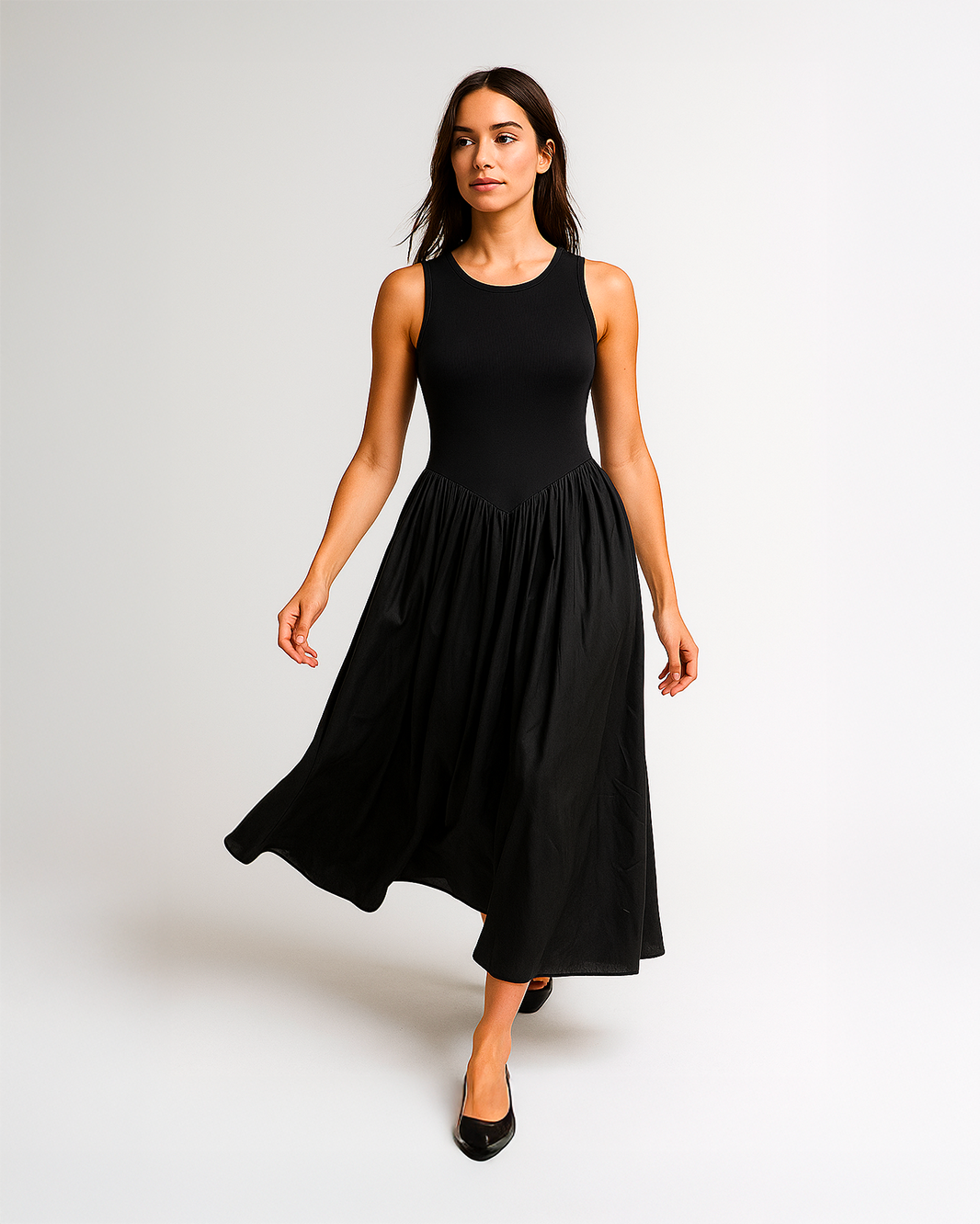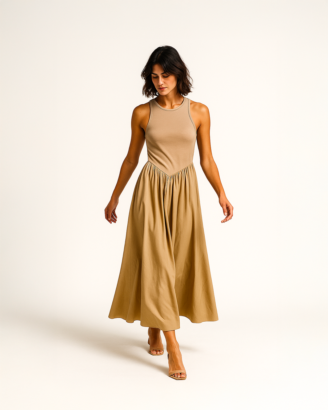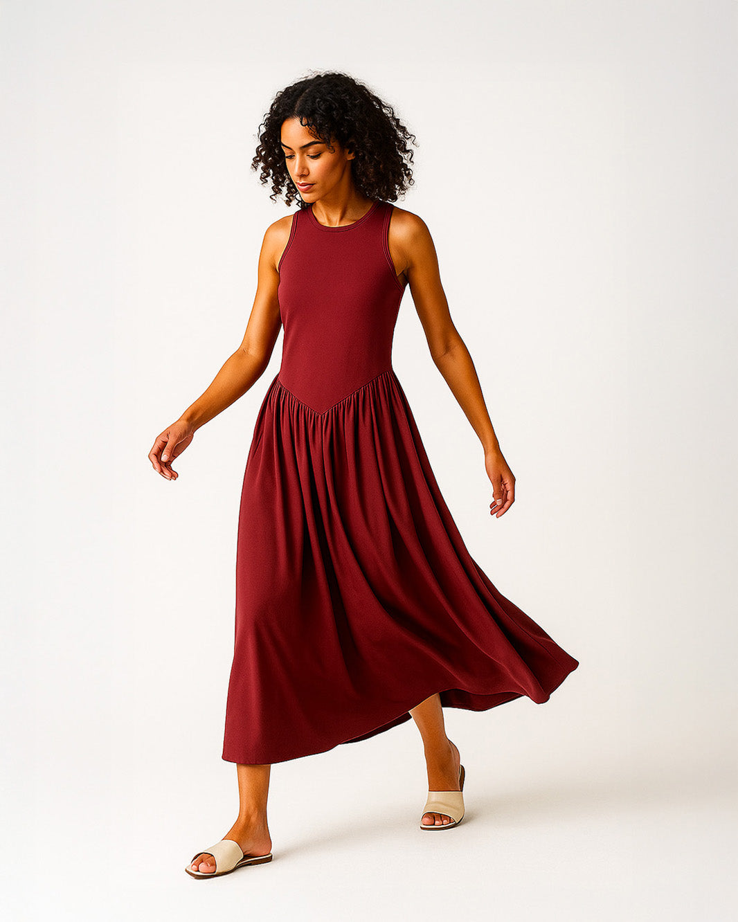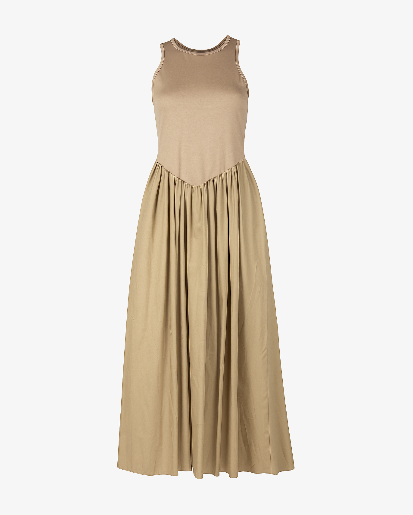 Abito midi fluido e senza maniche. Eleganza minimal e comfort si incontrano in questo modello dal corpetto aderente e gonna morbida a pieghe che valorizza il movimento. Un capo versatile, ideale dal giorno alla sera con il semplice cambio di accessori.