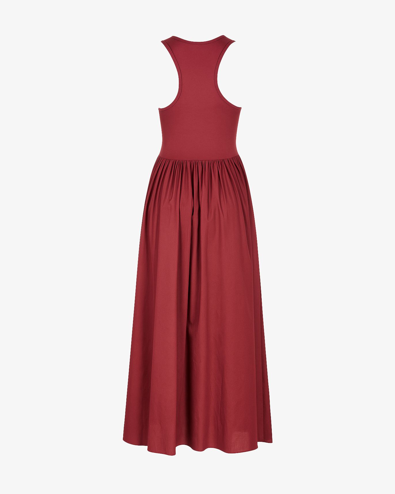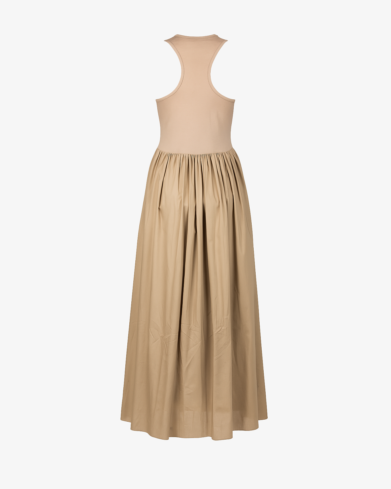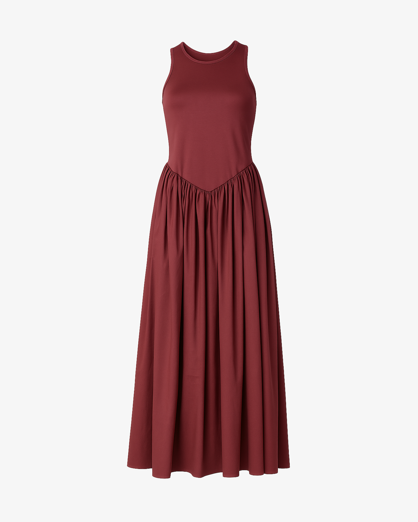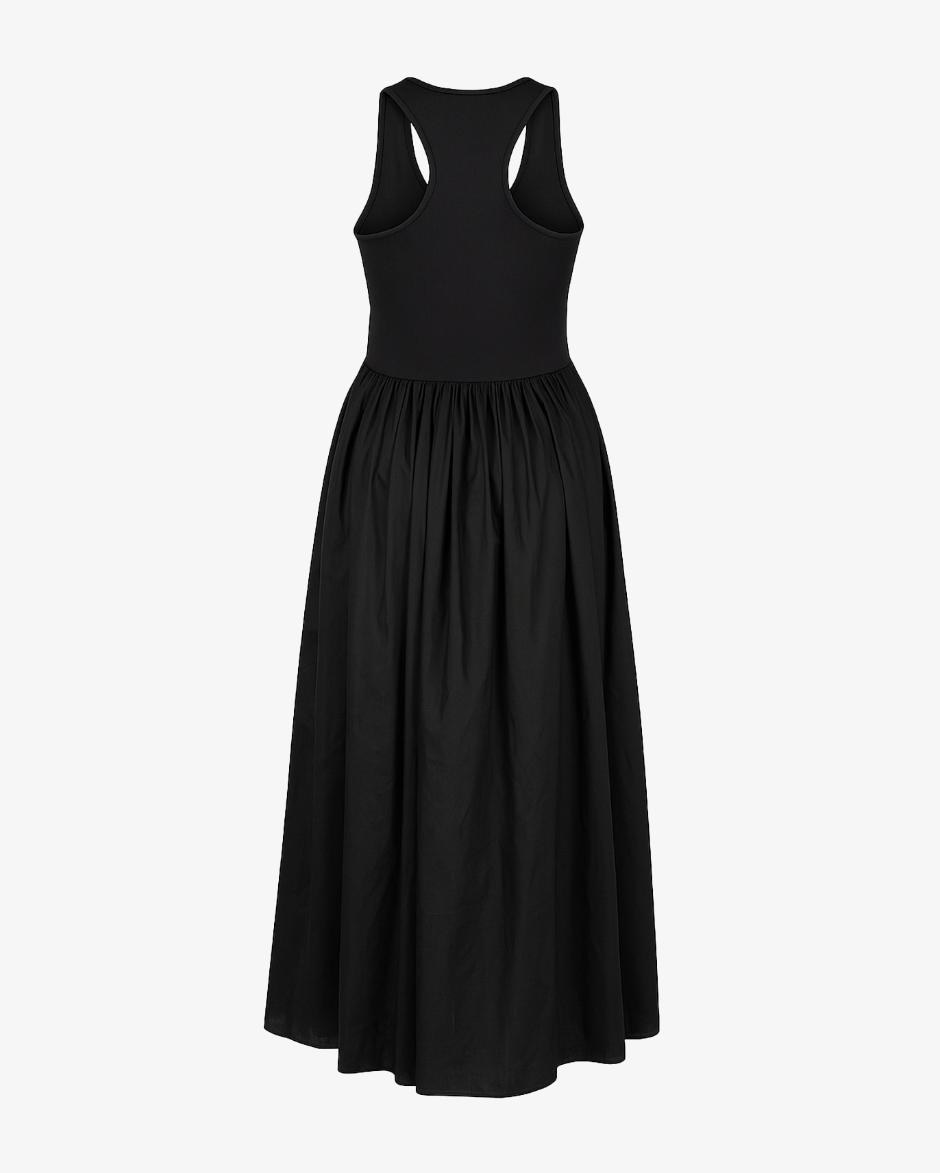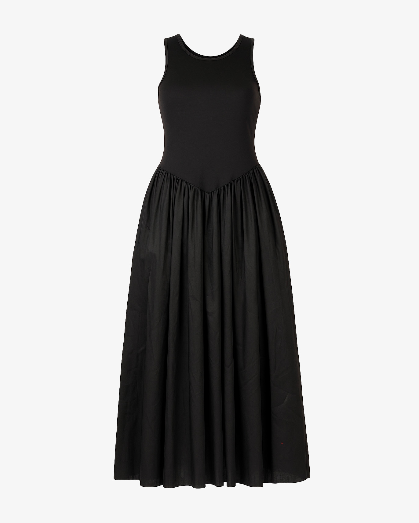 Abito midi fluido e senza maniche. Eleganza minimal e comfort si incontrano in questo modello dal corpetto aderente e gonna morbida a pieghe che valorizza il movimento. Un capo versatile, ideale dal giorno alla sera con il semplice cambio di accessori.