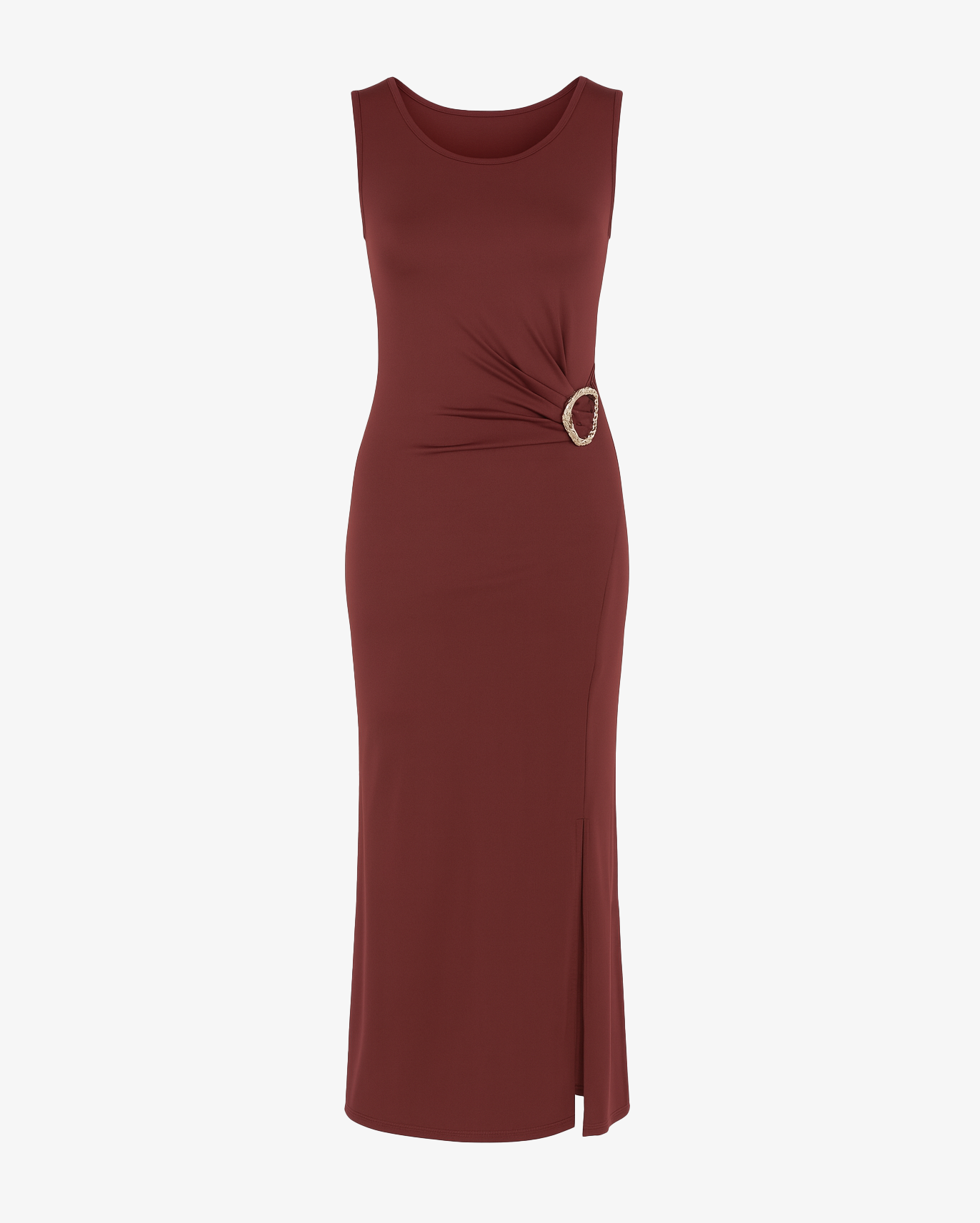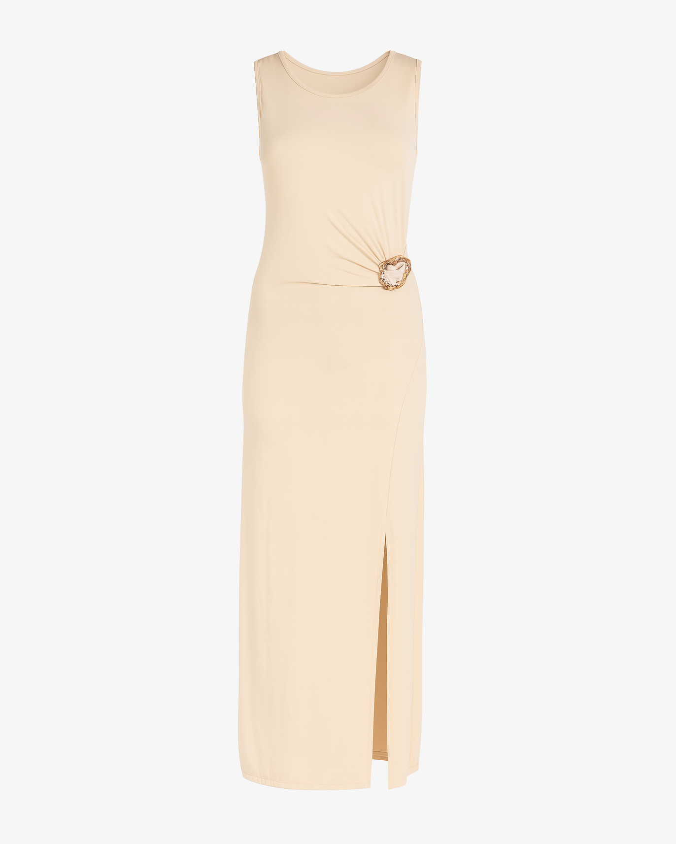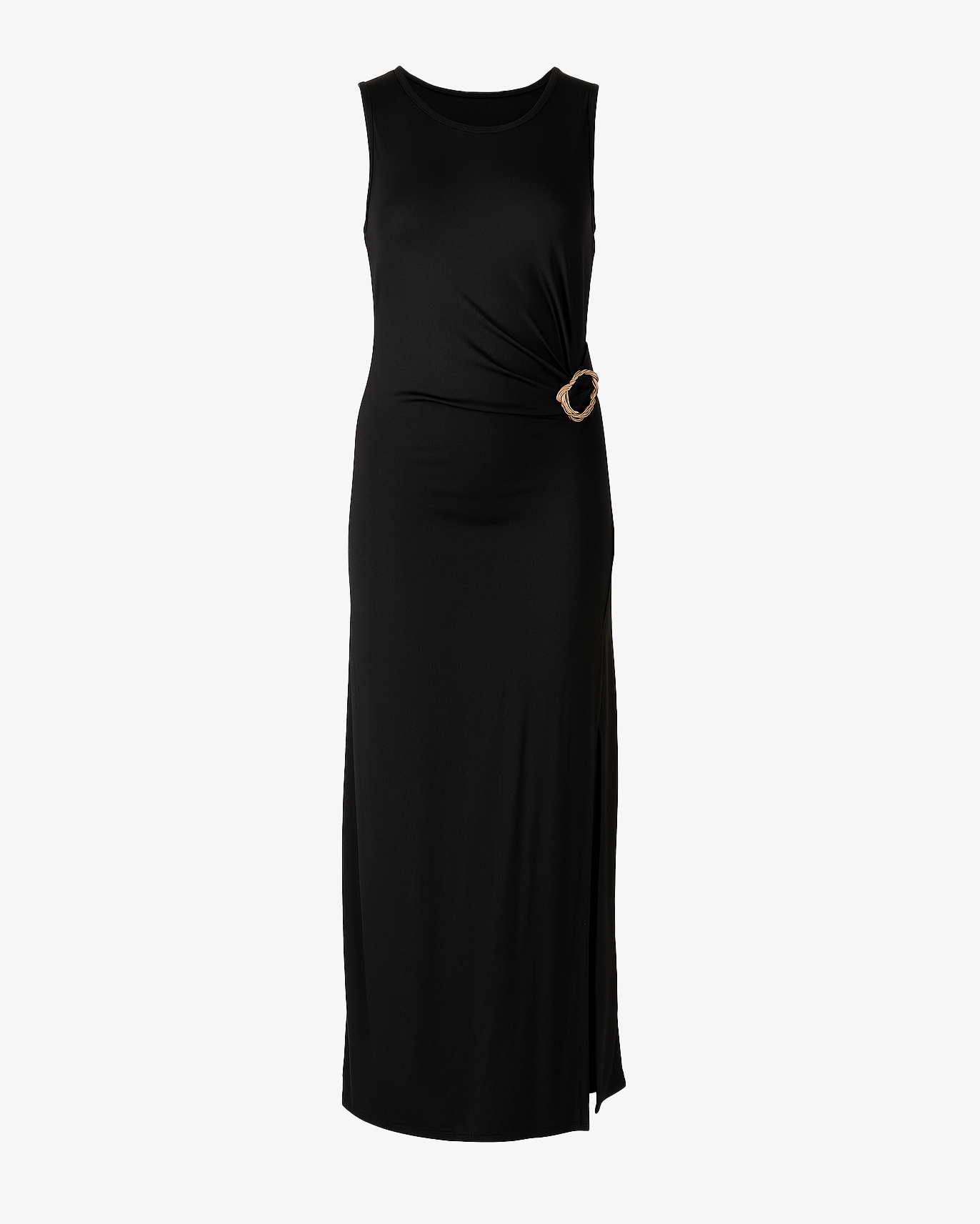 Abito lungo senza maniche con dettaglio fibbia dorata sul fianco. Un modello elegante e sofisticato che slancia la silhouette, arricchito da un drappeggio laterale e spacco discreto per un tocco di femminilità.