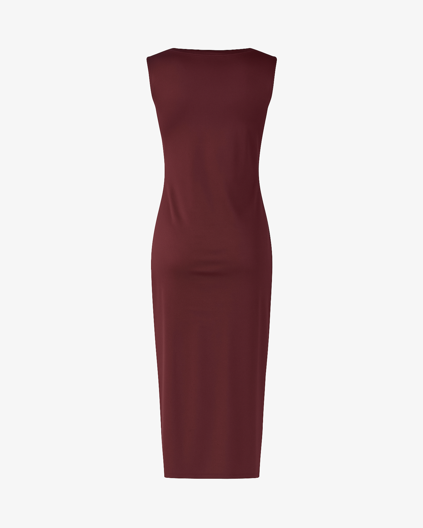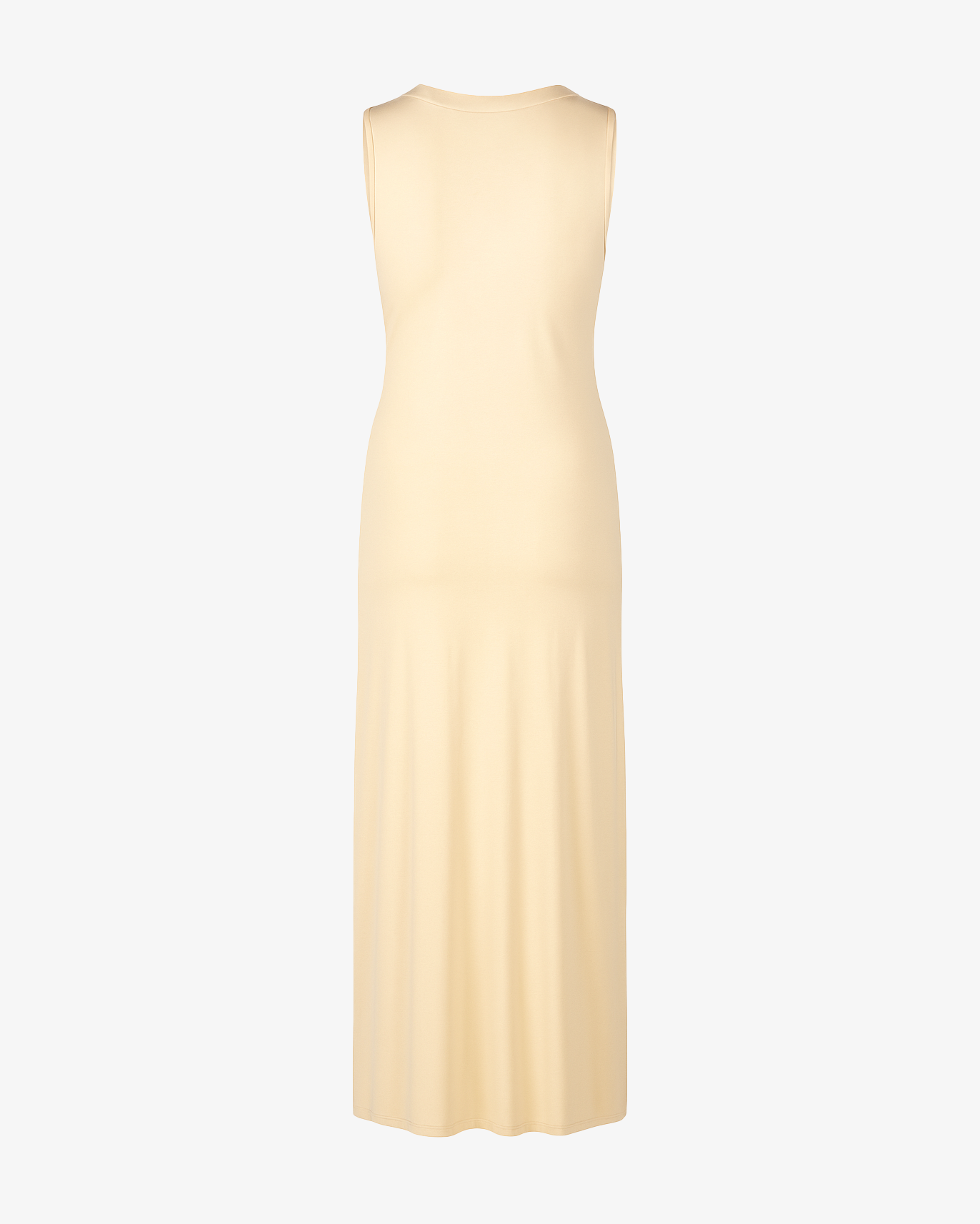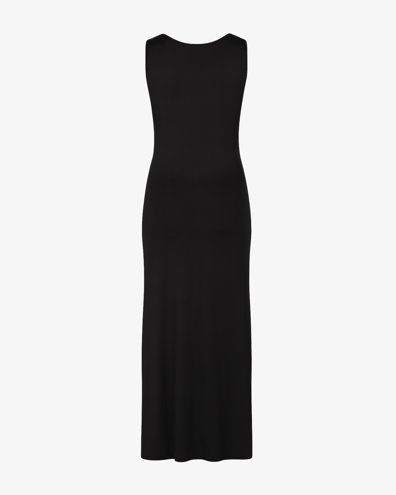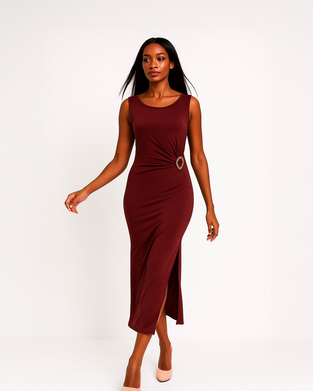 Abito lungo senza maniche con dettaglio fibbia dorata sul fianco. Un modello elegante e sofisticato che slancia la silhouette, arricchito da un drappeggio laterale e spacco discreto per un tocco di femminilità.
