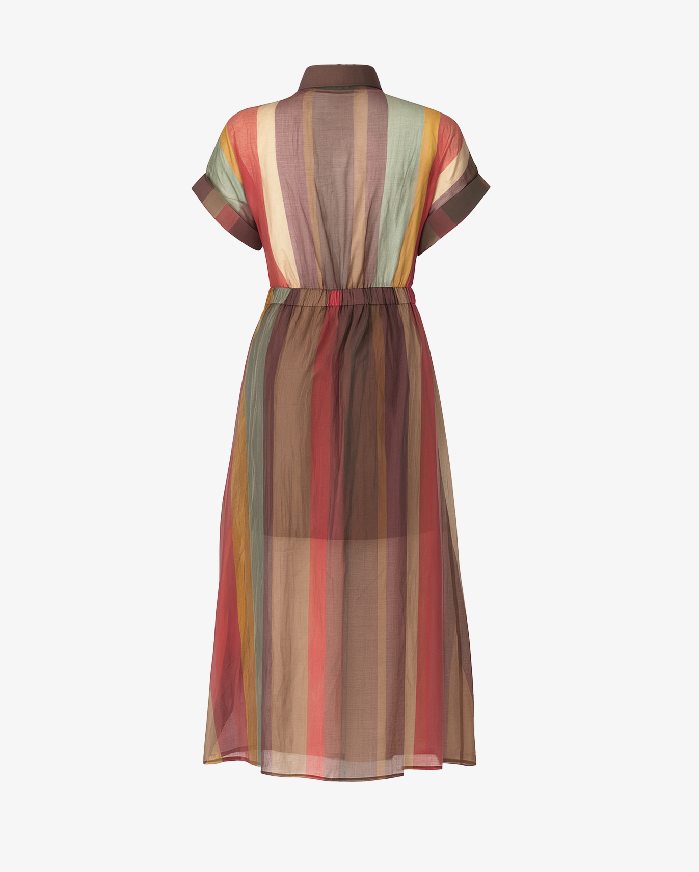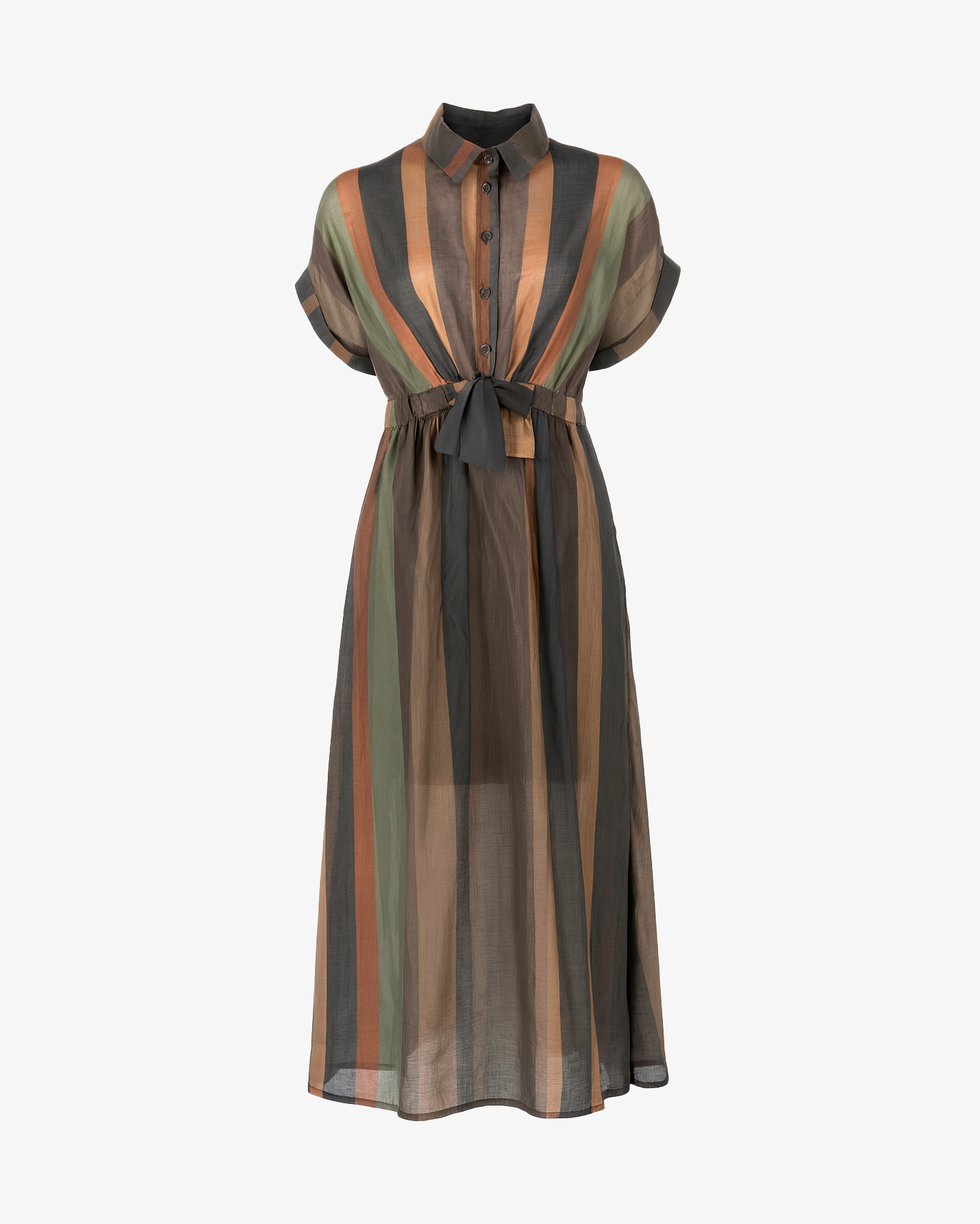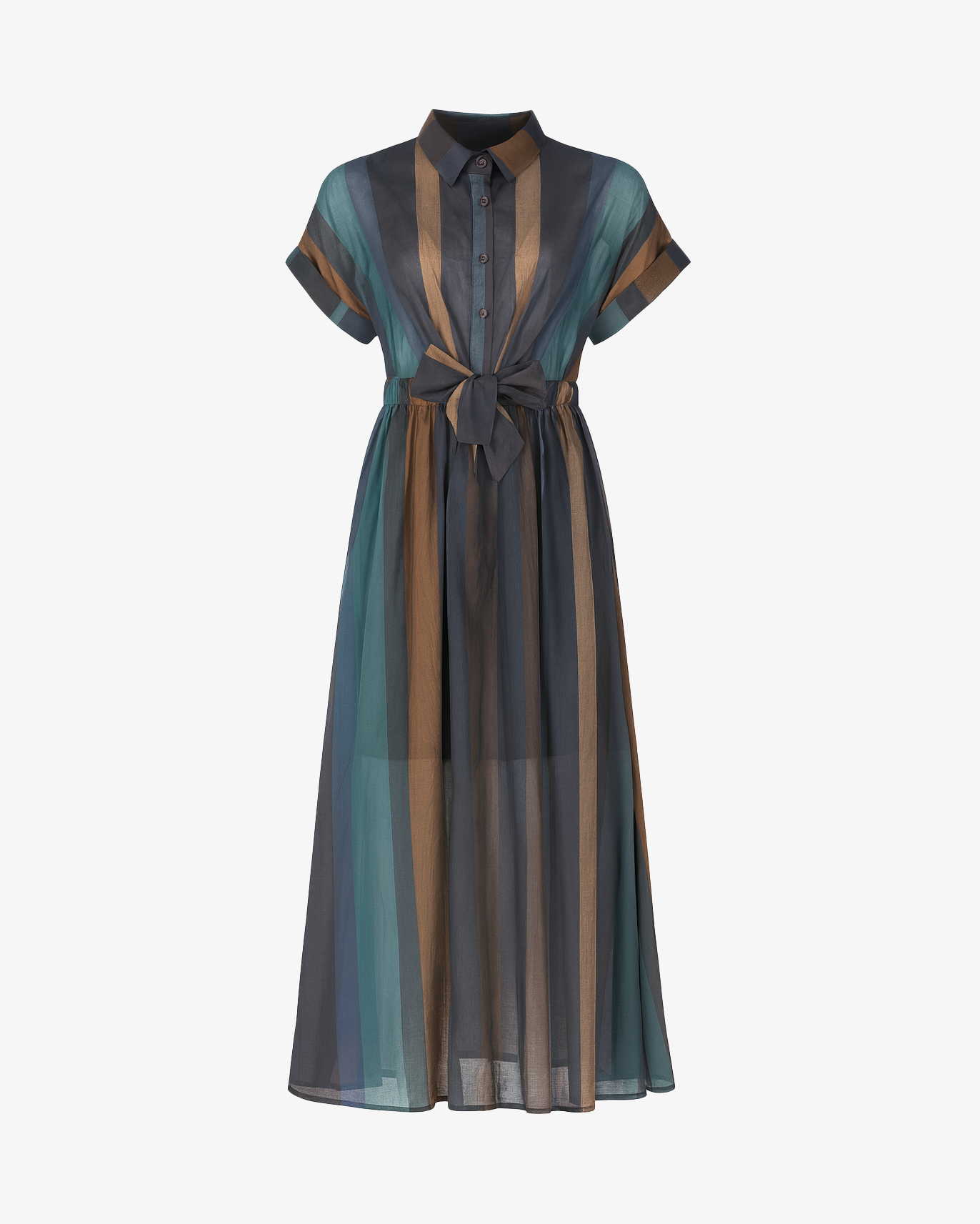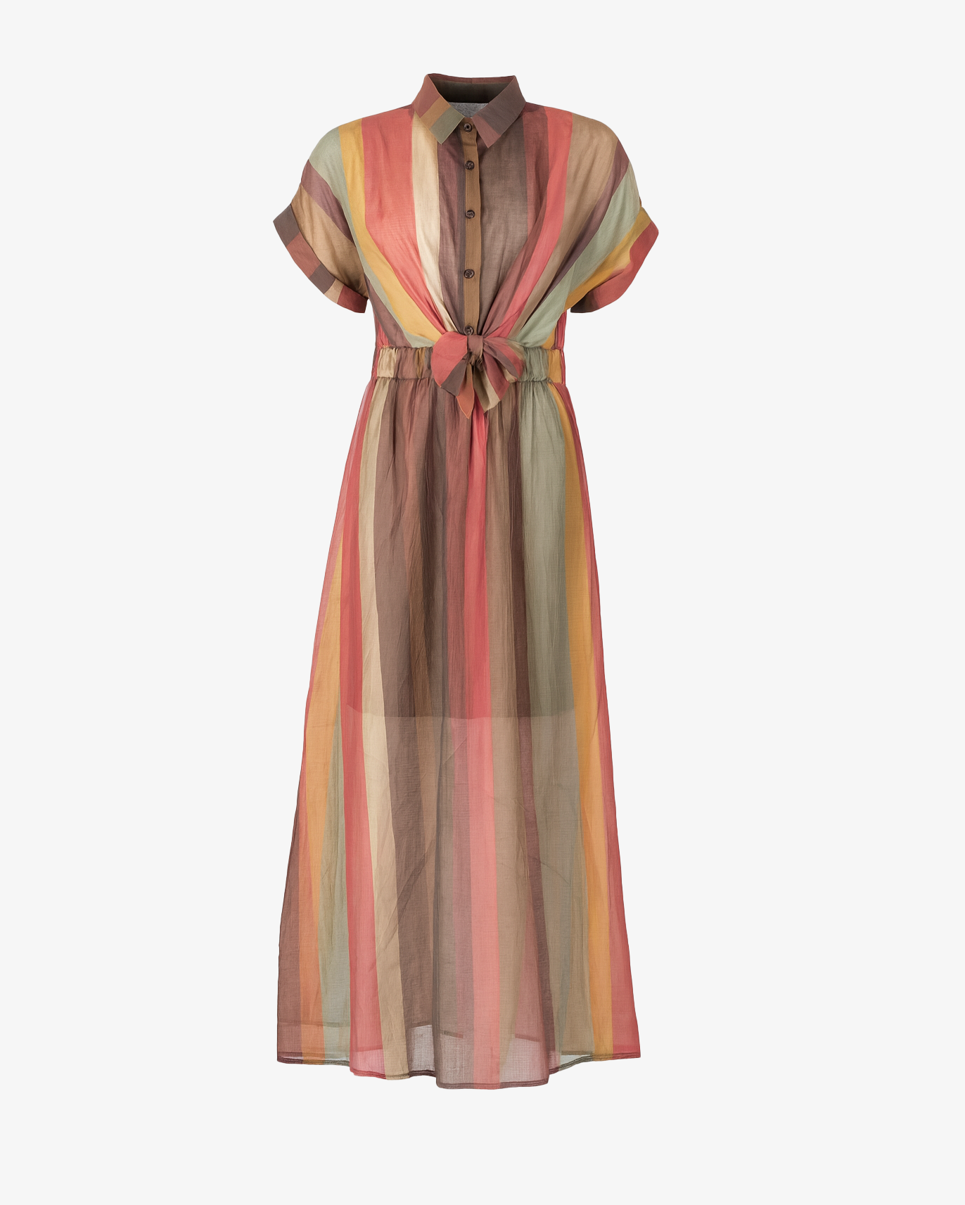 Abito lungo chemisier in voile a righe multicolor. Modello con colletto, bottoni frontali e nodo in vita che sottolinea la silhouette, perfetto per look estivi freschi e pieni di personalità.