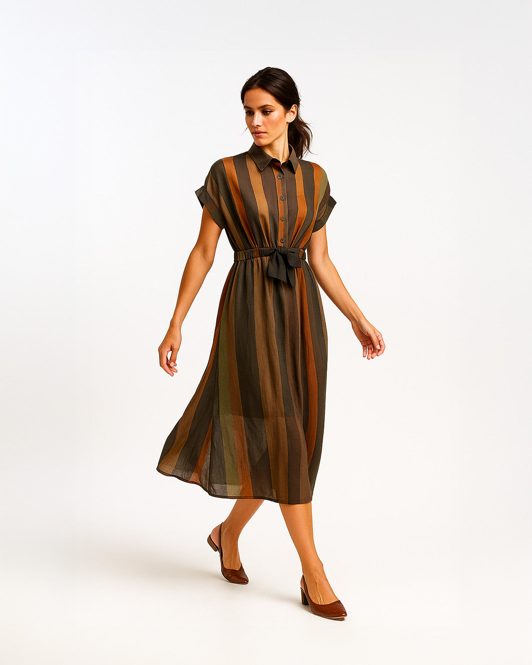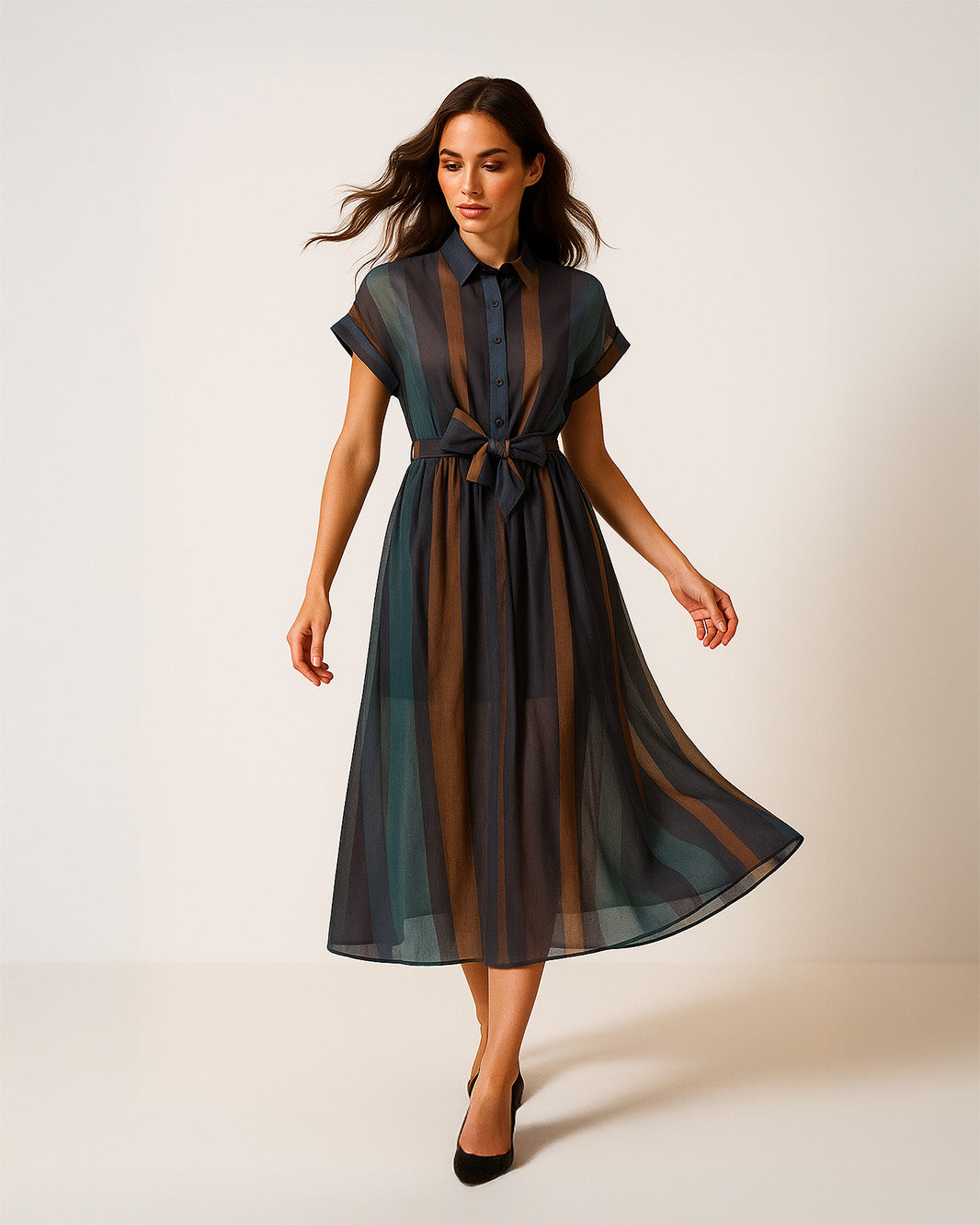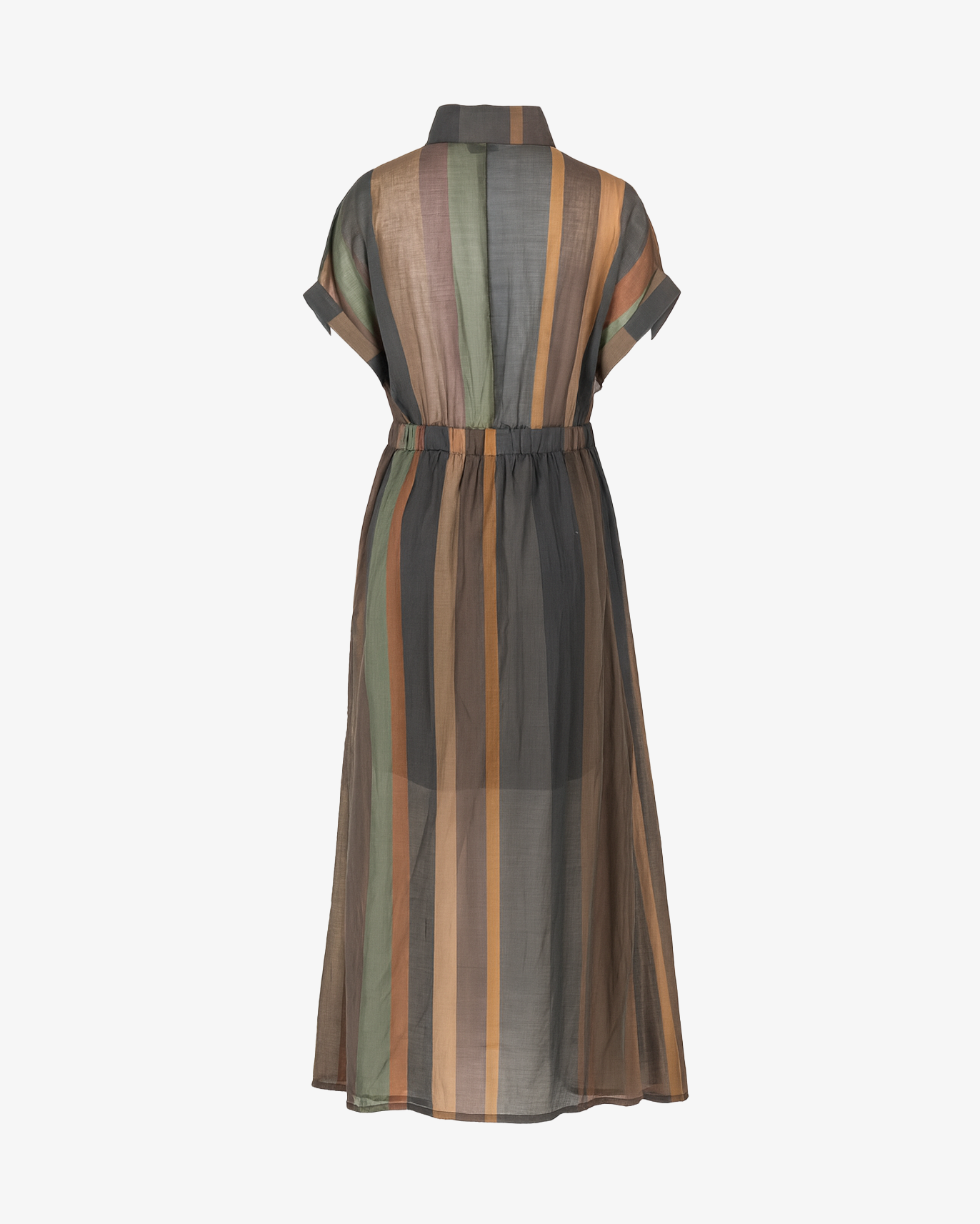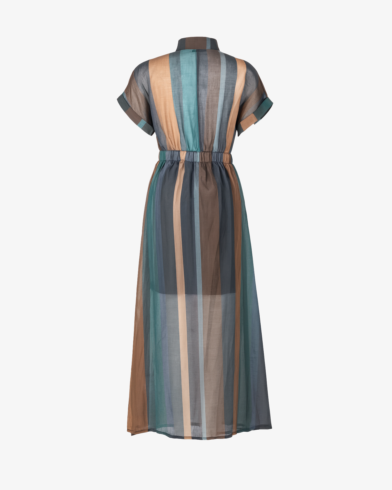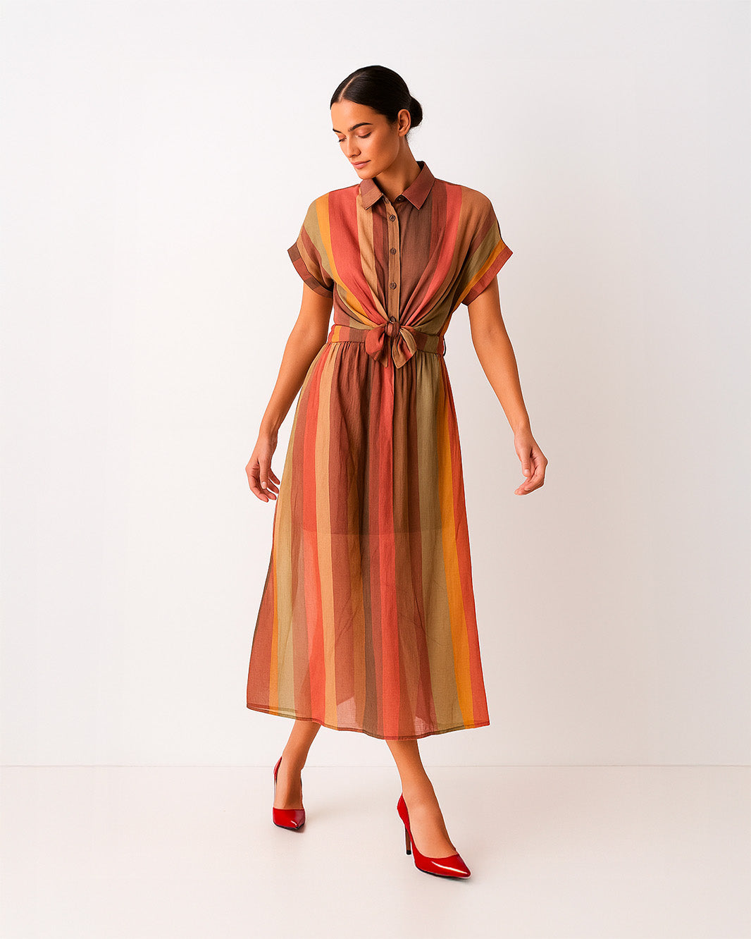 Abito lungo chemisier in voile a righe multicolor. Modello con colletto, bottoni frontali e nodo in vita che sottolinea la silhouette, perfetto per look estivi freschi e pieni di personalità.