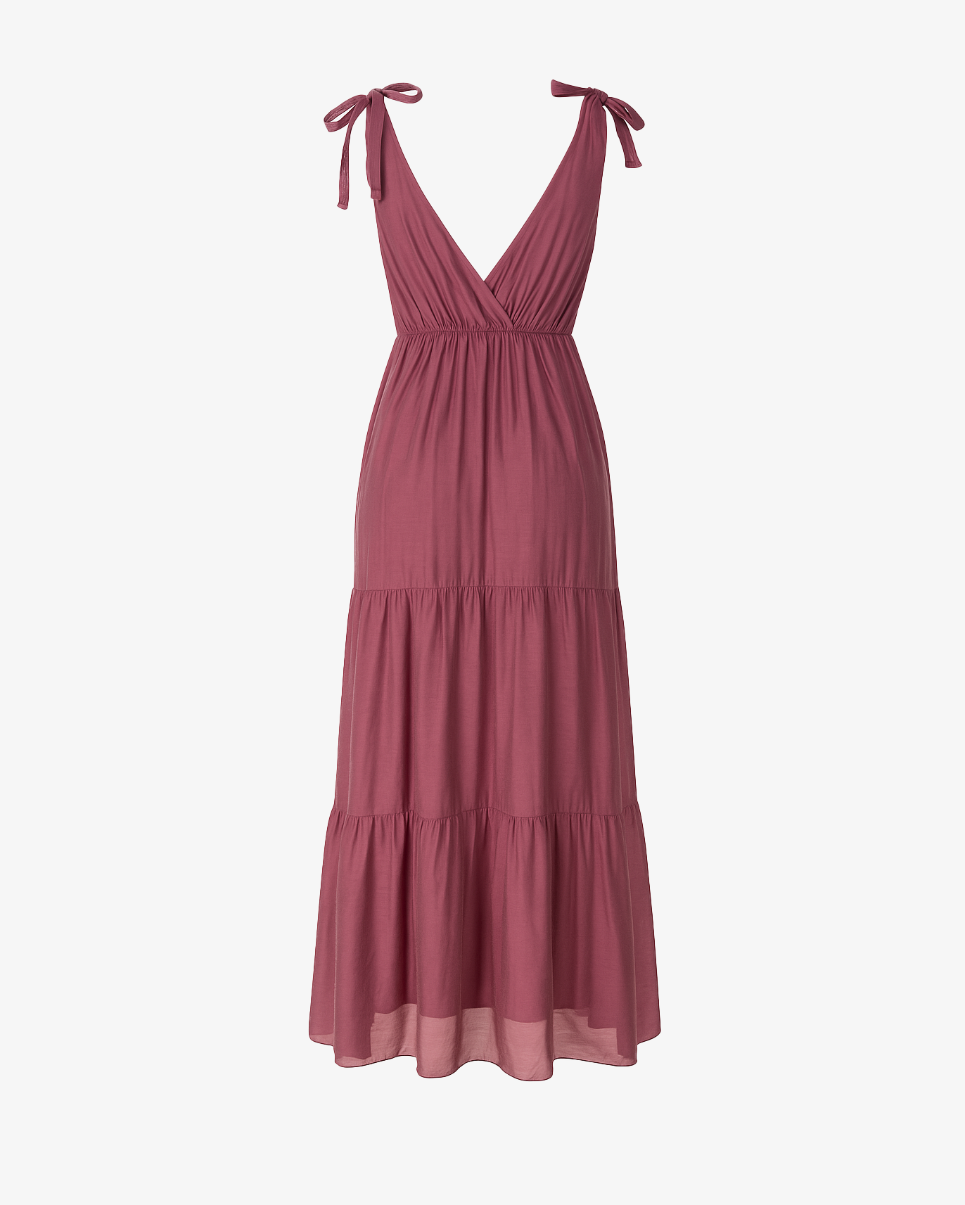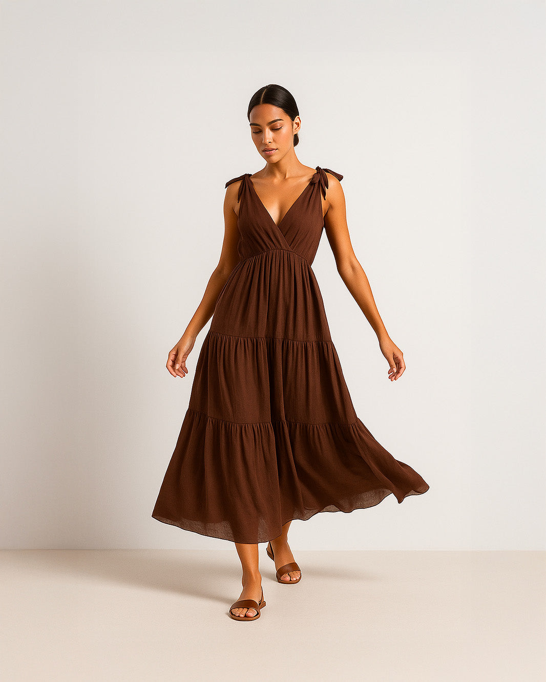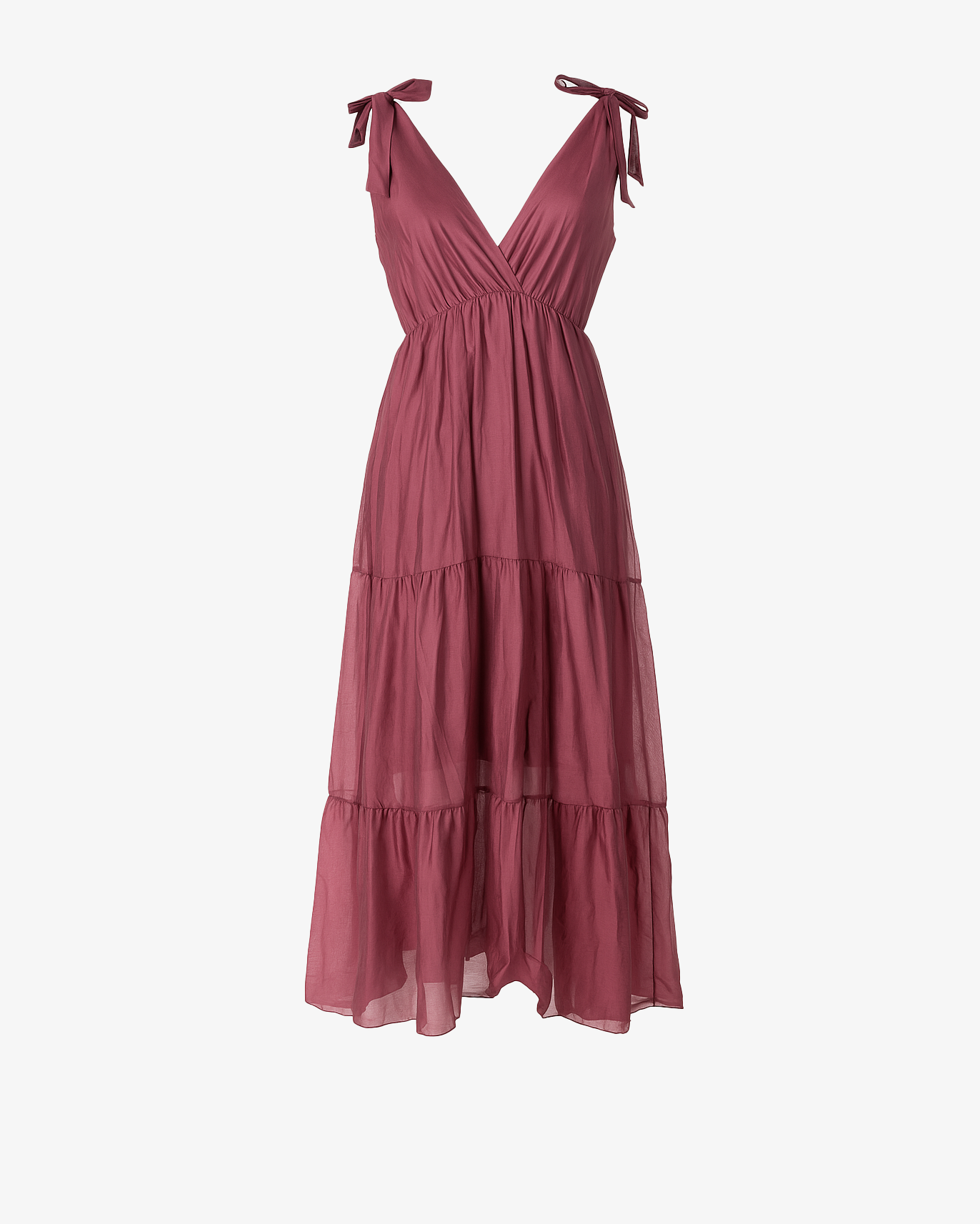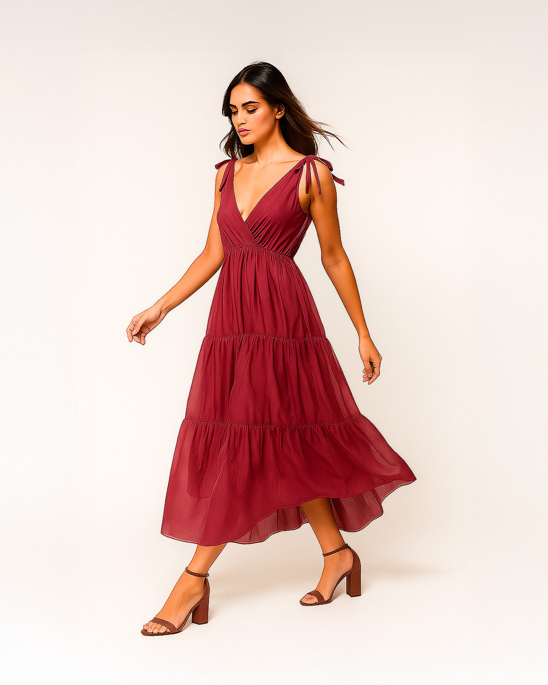 Modello con scollo a V incrociato, spalline annodate e gonna a balze.