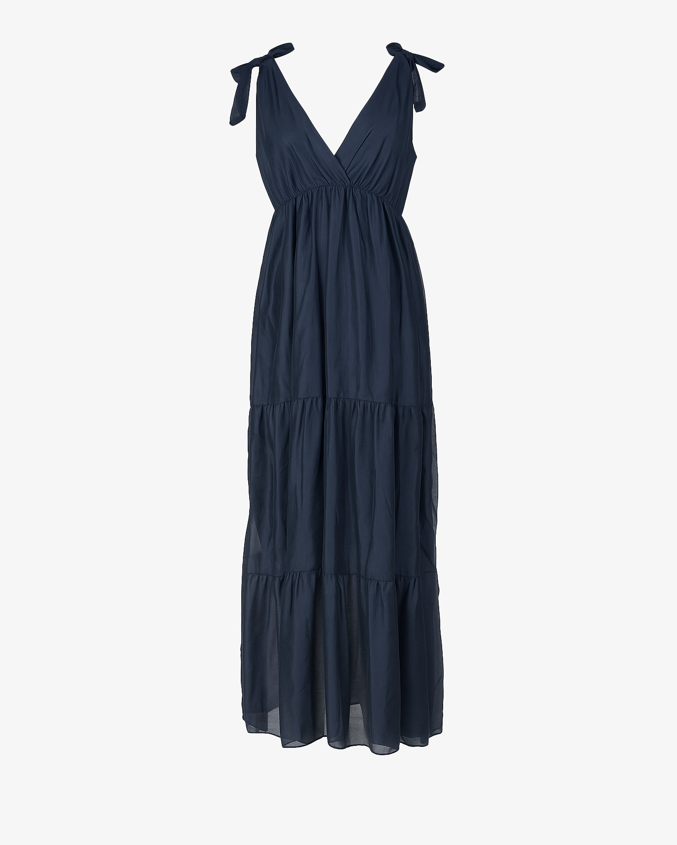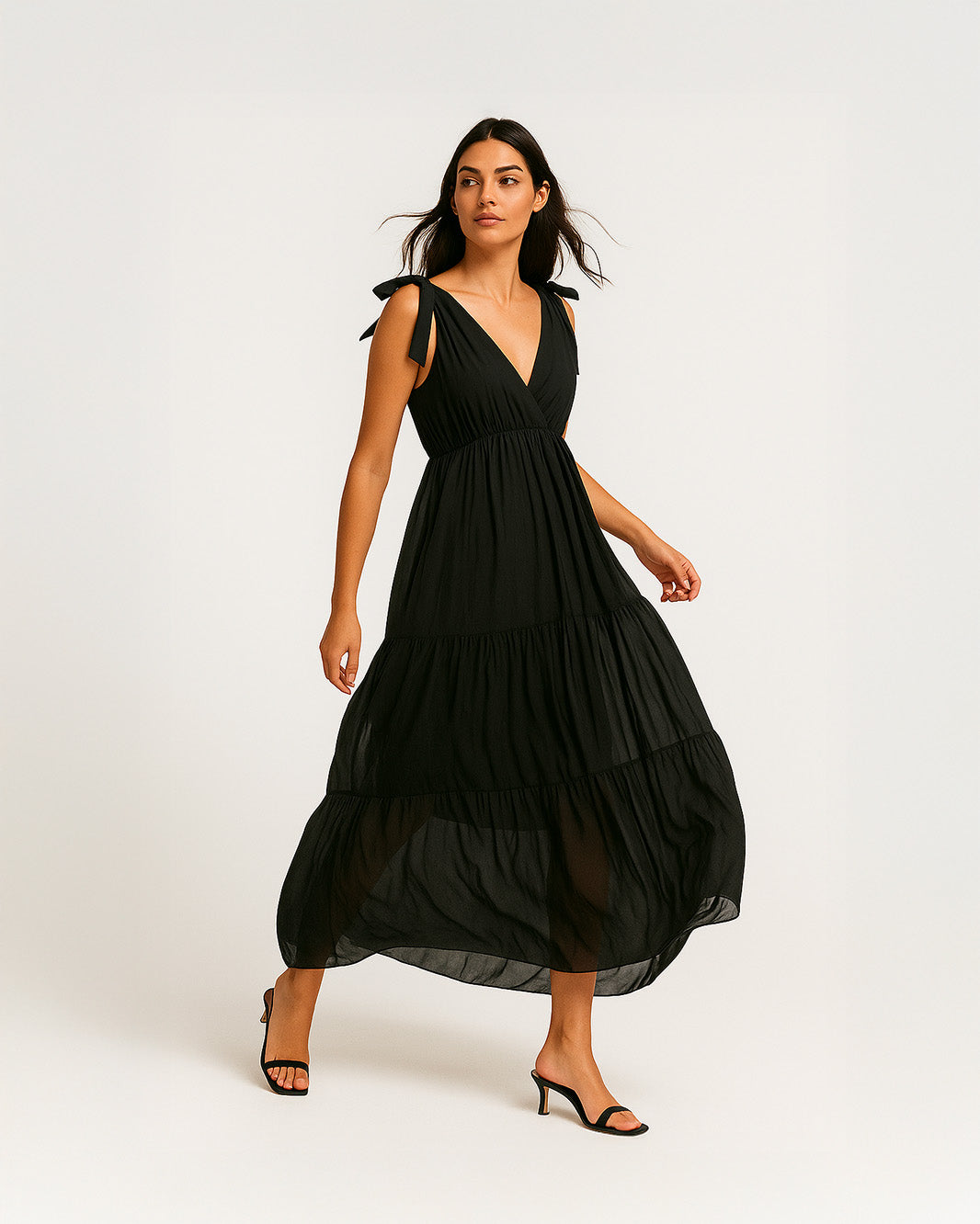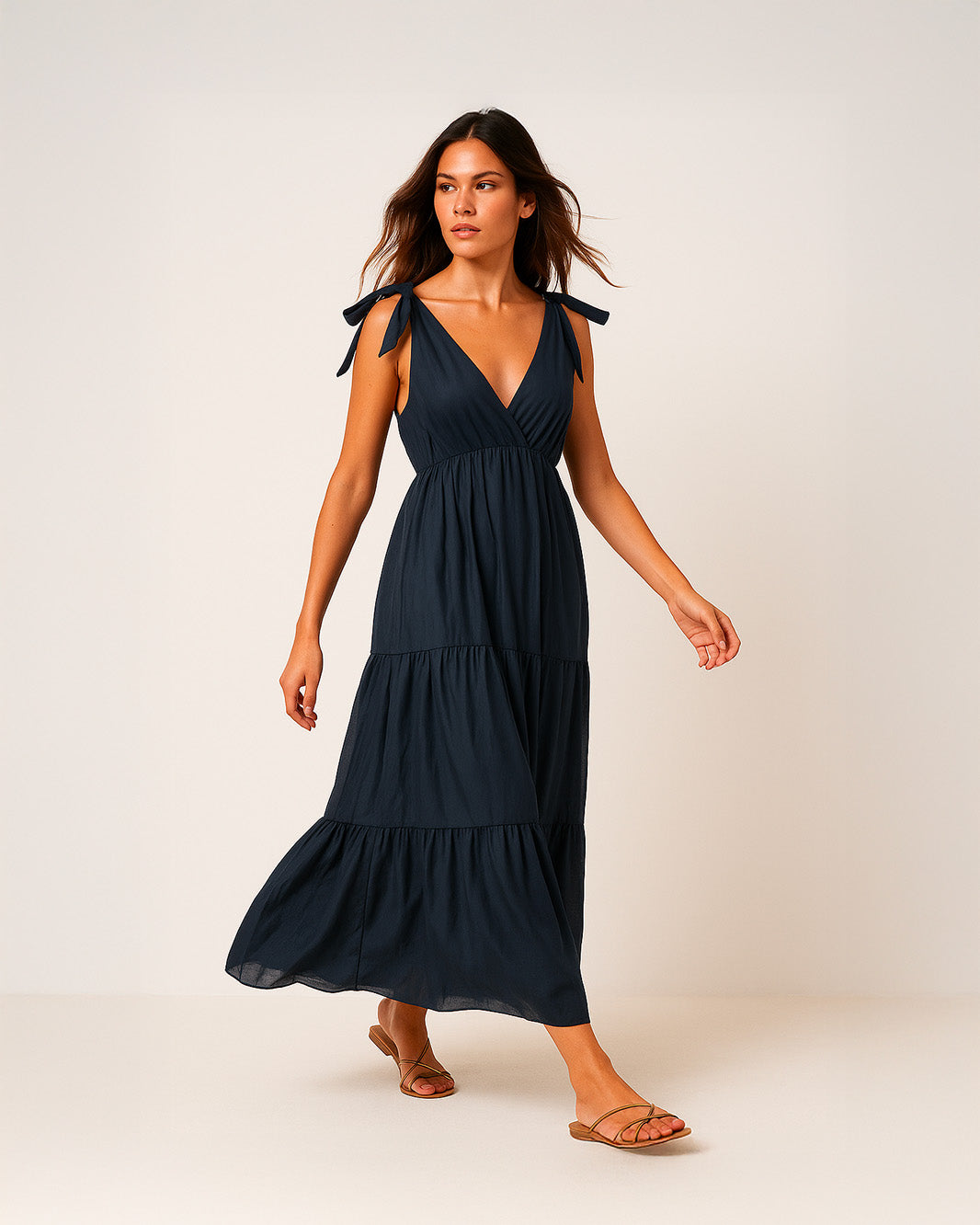 Modello con scollo a V incrociato, spalline annodate e gonna a balze.