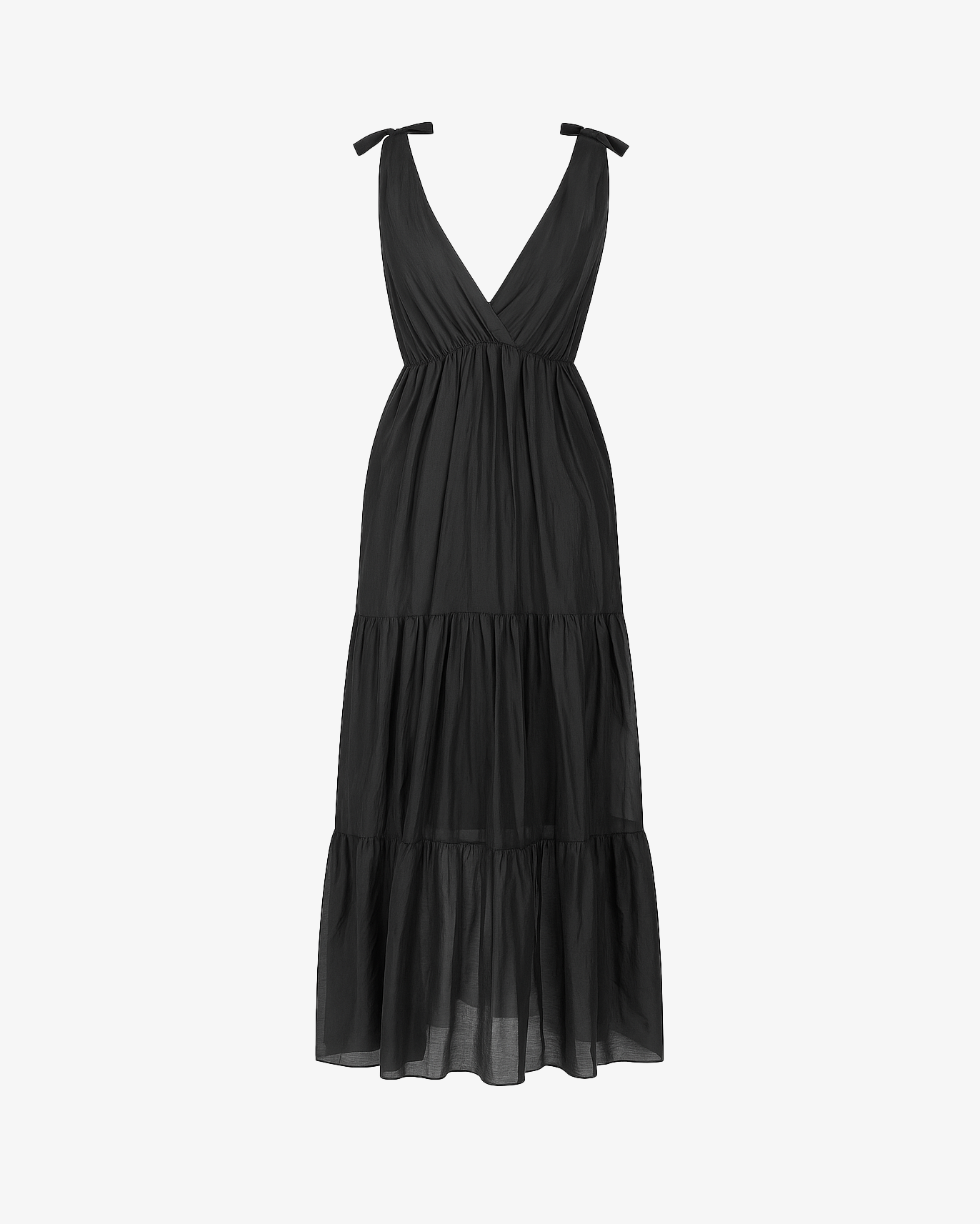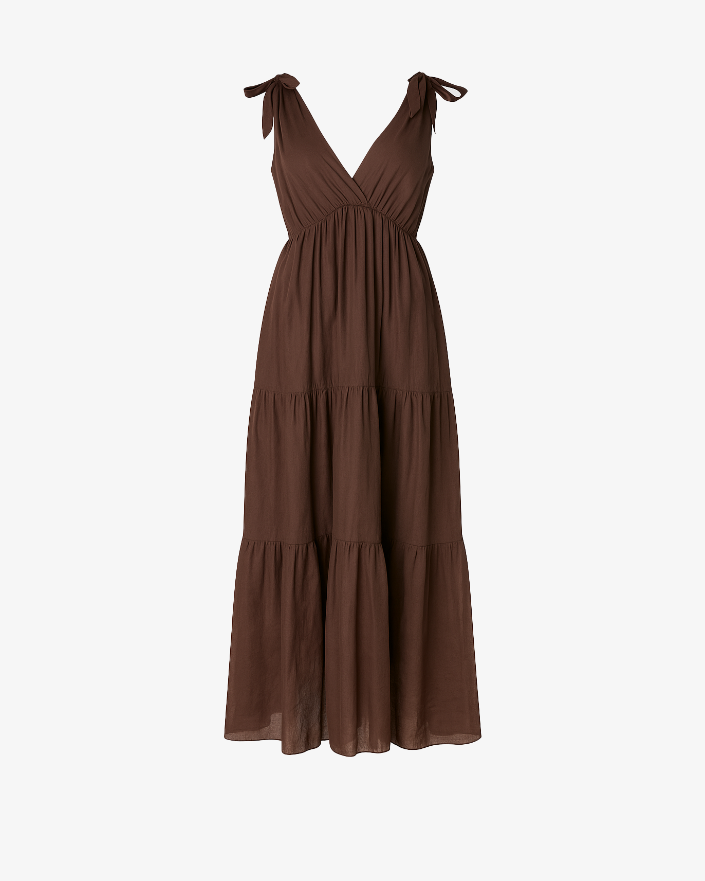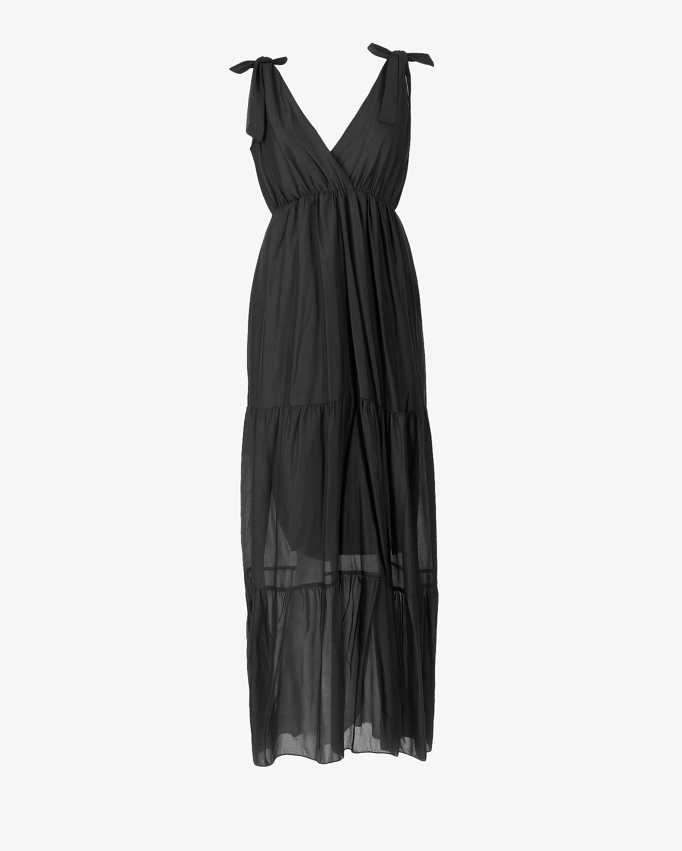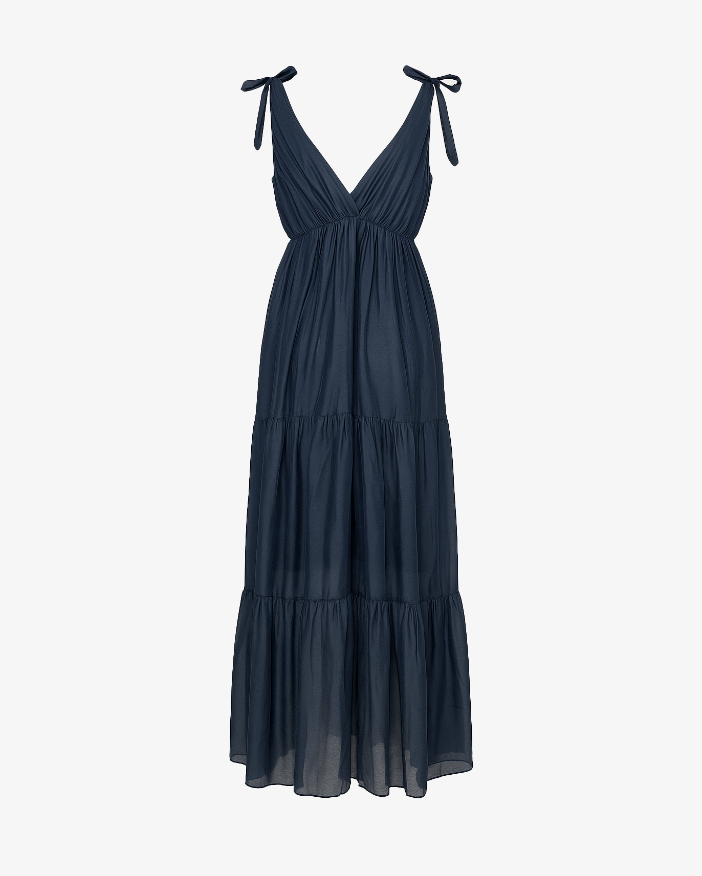 Modello con scollo a V incrociato, spalline annodate e gonna a balze.