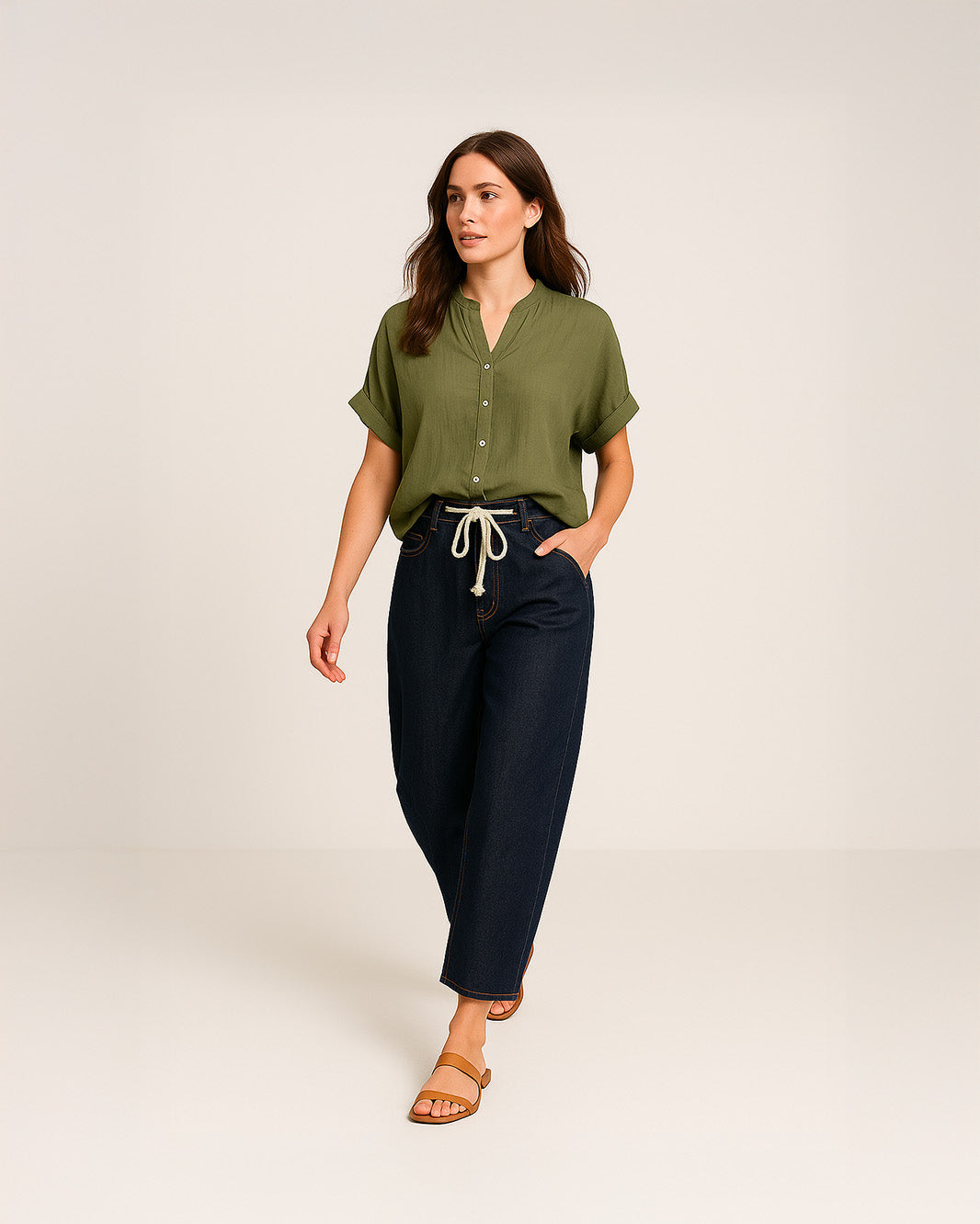 Camicia in lino con collo alla coreana. Fresca e versatile, dal taglio morbido e leggermente asimmetrico, è perfetta per look casual raffinati da indossare nelle giornate più calde.