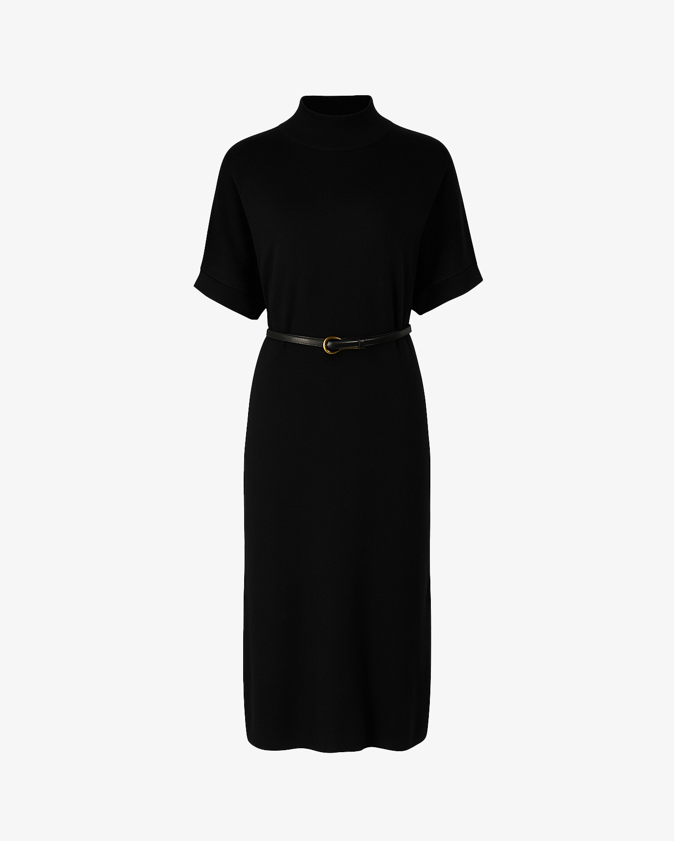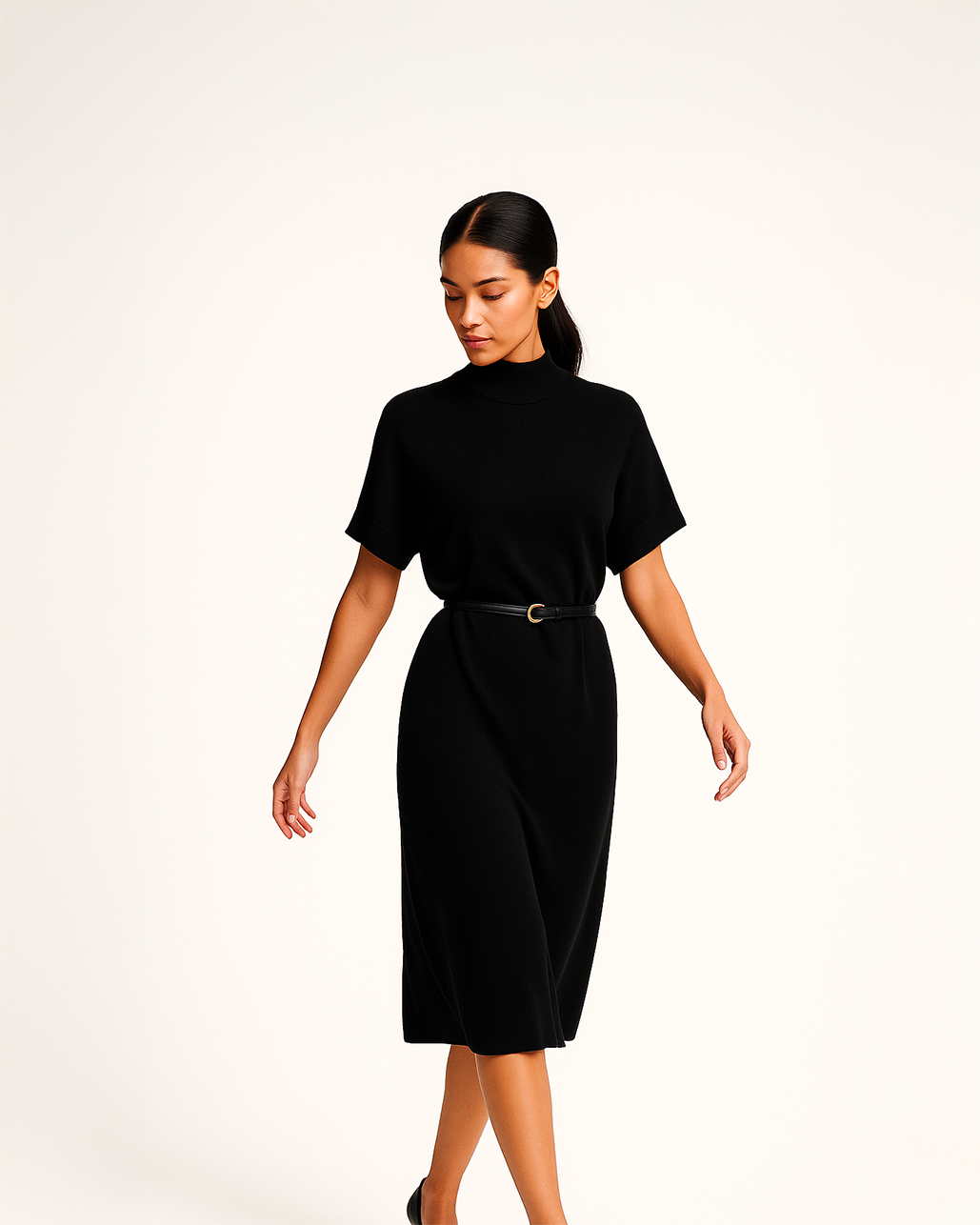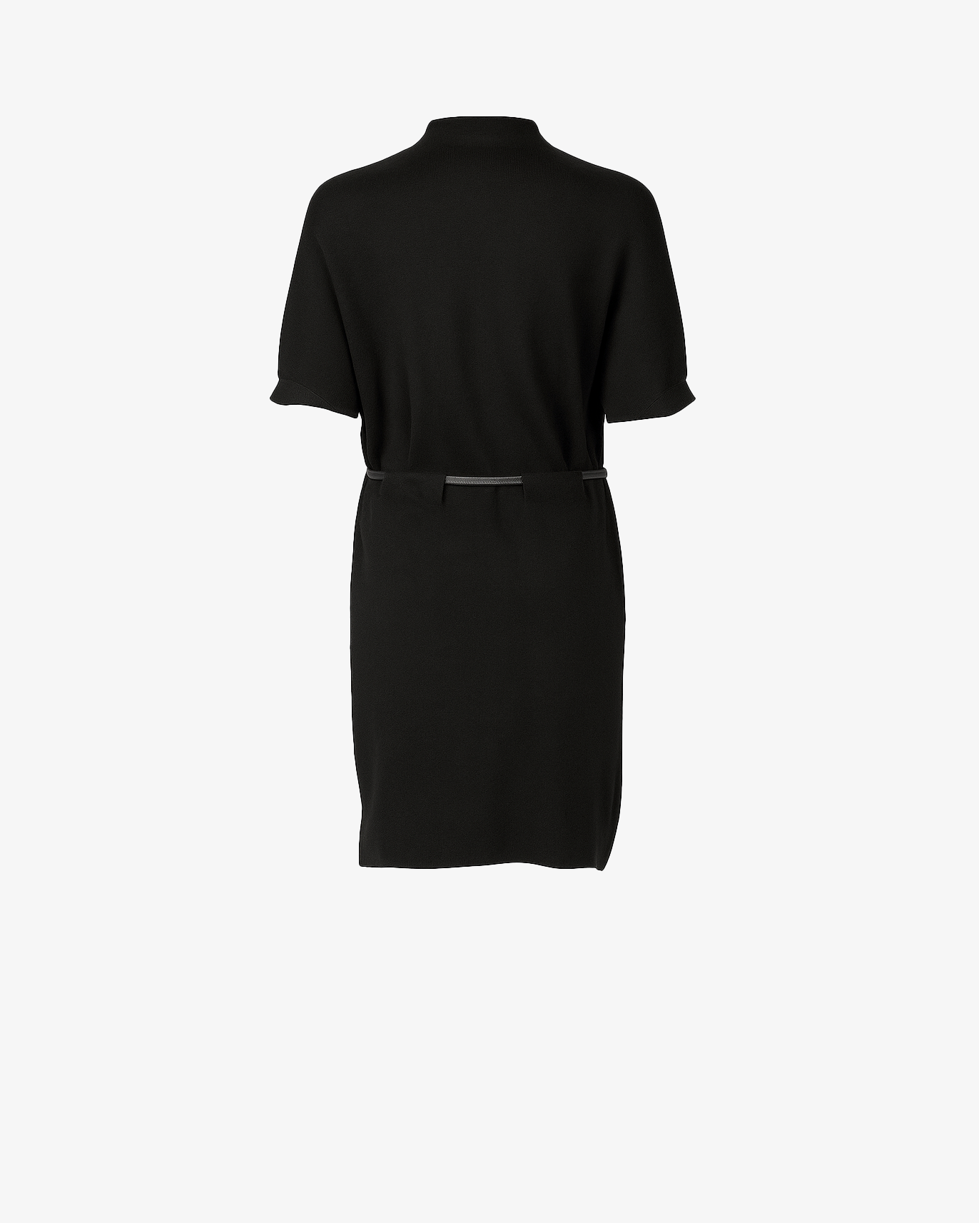 Un capo versatile e sofisticato, realizzato in morbida maglia dal design minimal. La linea dritta viene valorizzata dalla cintura in vita con fibbia metallica, che scolpisce la silhouette con eleganza. Il collo alto e le maniche corte aggiungono un tocco moderno e raffinato.