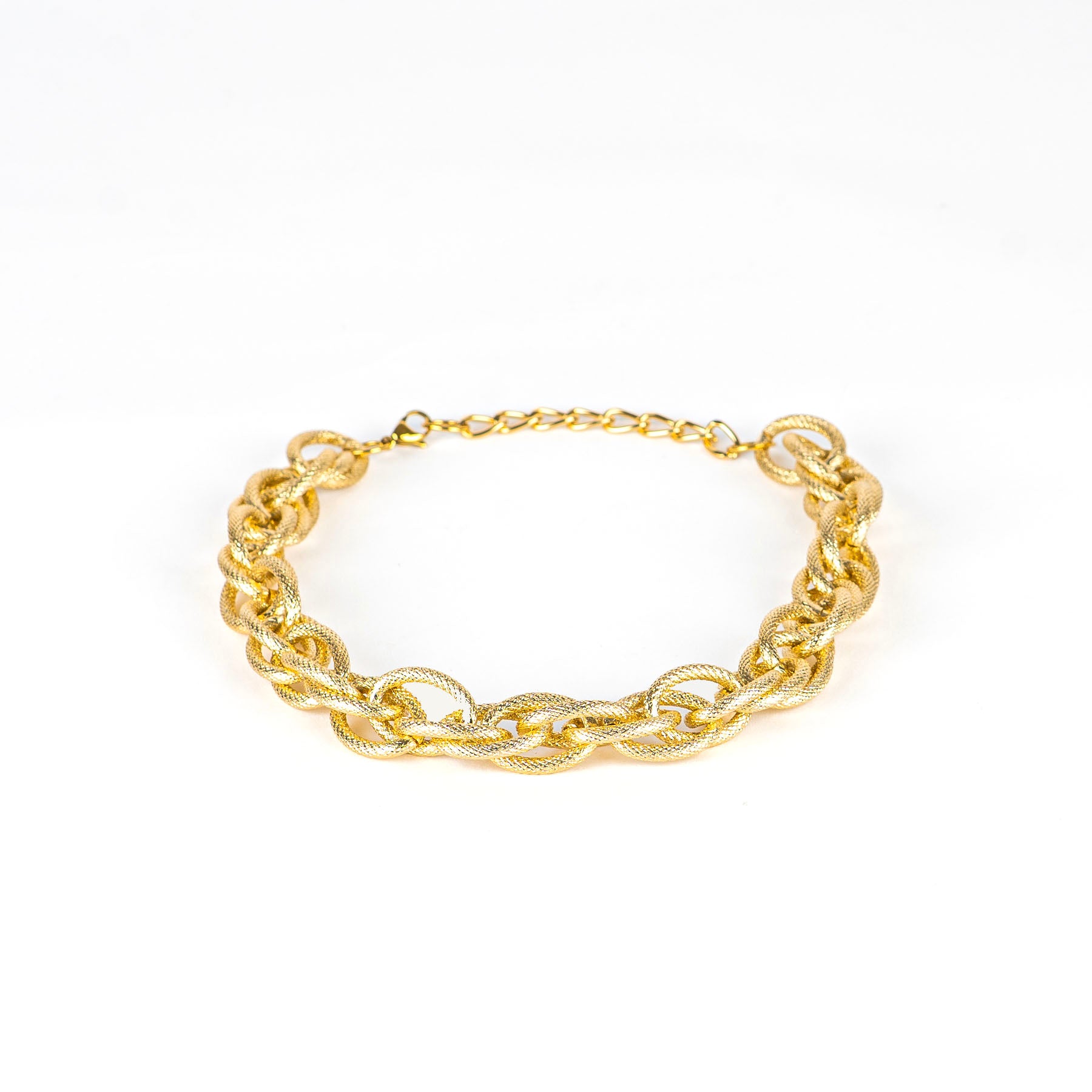 Bracciale a catena con maglie intrecciate effetto corda e finitura dorata. La texture ricca e il volume deciso lo rendono un accessorio protagonista, perfetto per dare carattere anche al look più semplice.