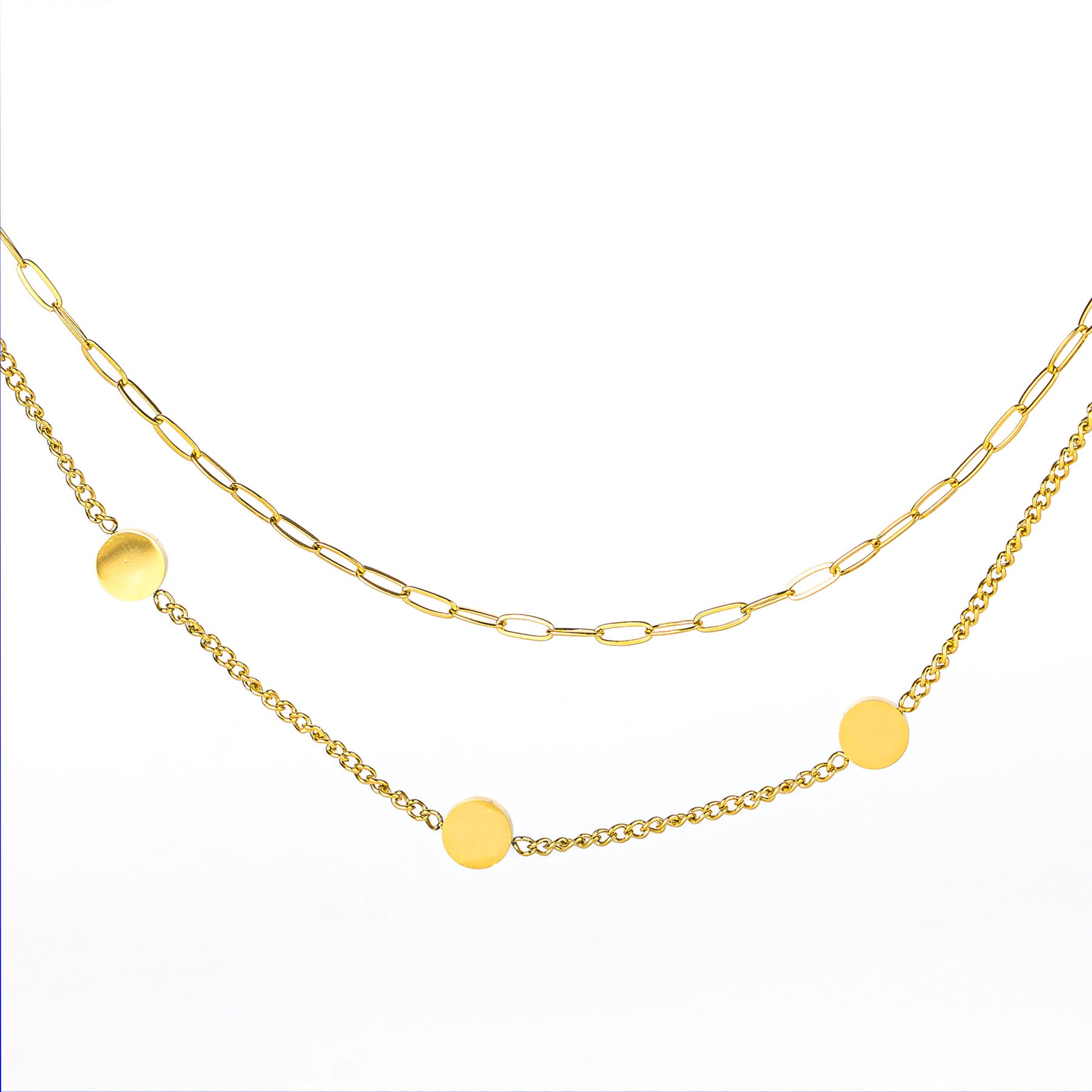 Collana a doppio filo con una catena a maglie allungate e una catena più sottile impreziosita da piccoli elementi tondi dorati. Il gioco di livelli crea subito un effetto “layering” elegante e contemporaneo, perfetto da indossare ogni giorno o per valorizzare un outfit da sera senza bisogno di altri accessori.