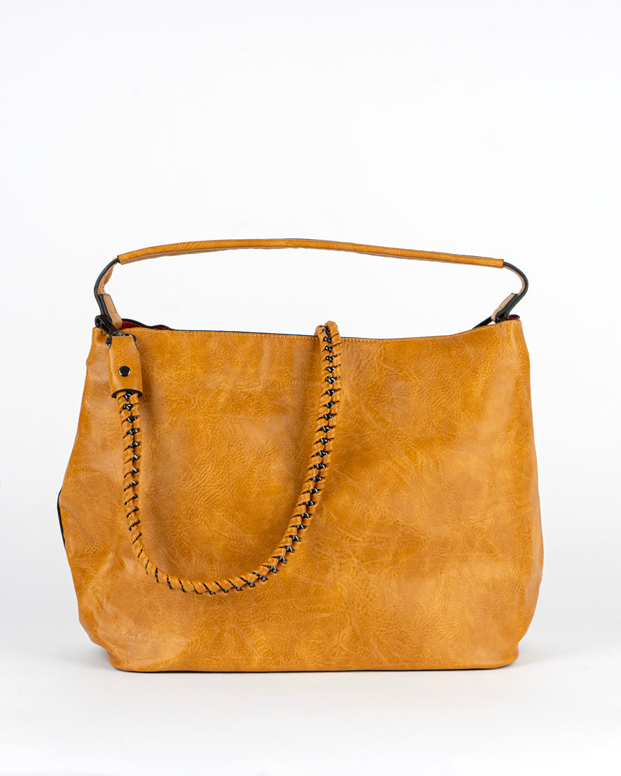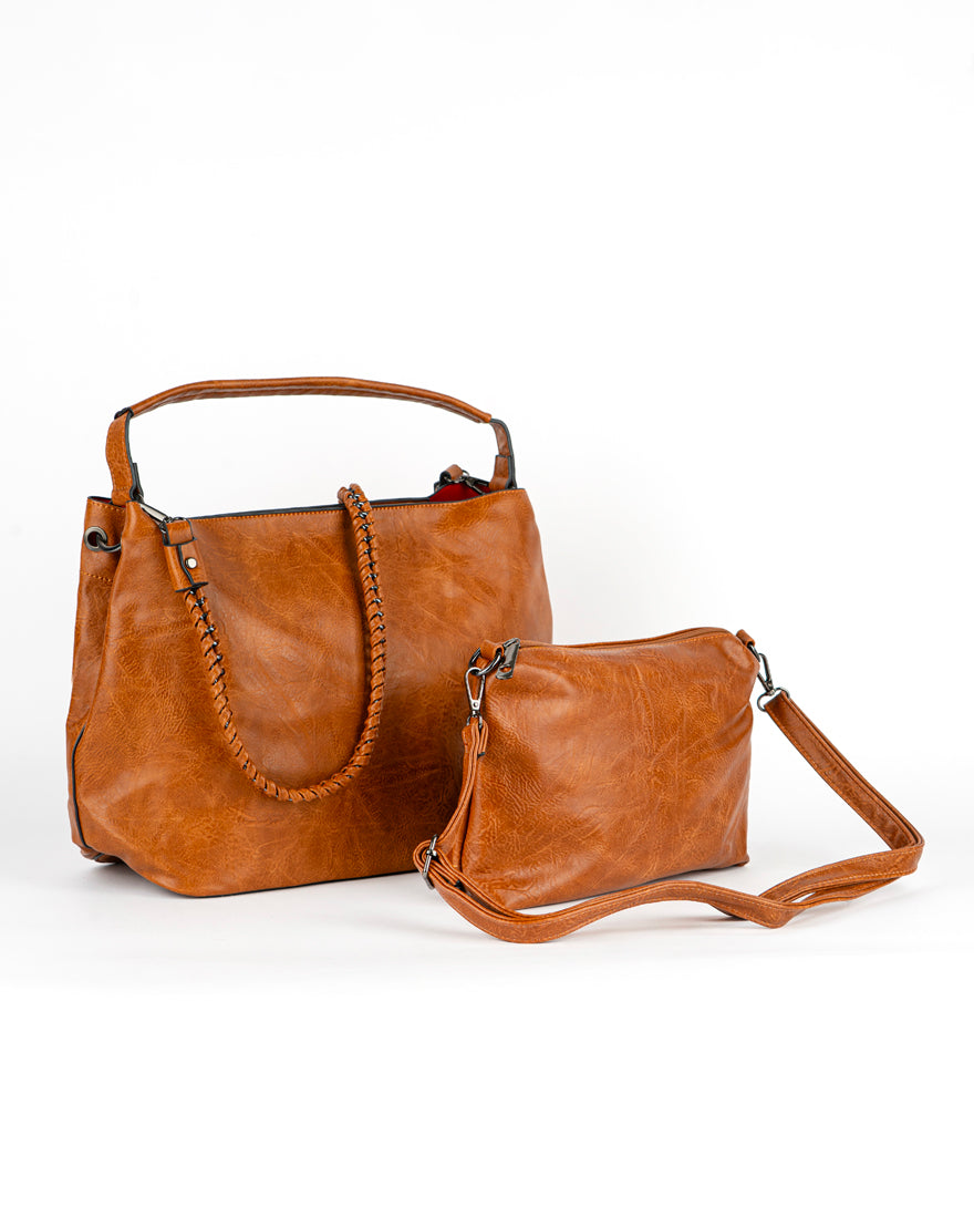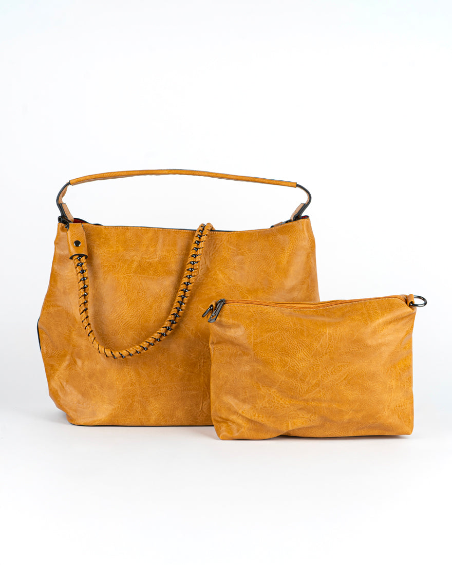 Elegante set composto da una maxi bag in intrecciato e una pochette coordinata. La borsa principale, realizzata con tecnica artigianale, offre ampio spazio per l'uso quotidiano mantenendo linee essenziali e raffinate. La pochette removibile garantisce versatilità: utilizzabile come accessorio indipendente o integrata nella maxi bag. Materiali di qualità e finiture curate caratterizzano questo duo funzionale, ideale per chi ricerca praticità senza compromessi estetici. Un investimento versatile che accompagna ogni occasione con discrezione e stile.