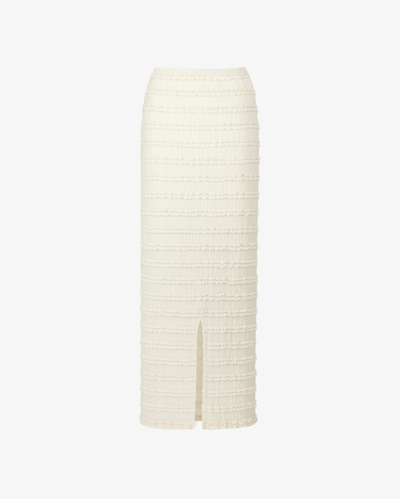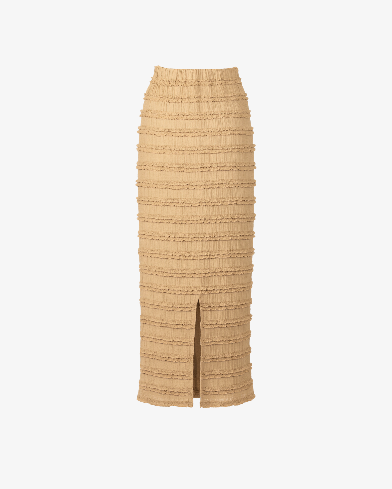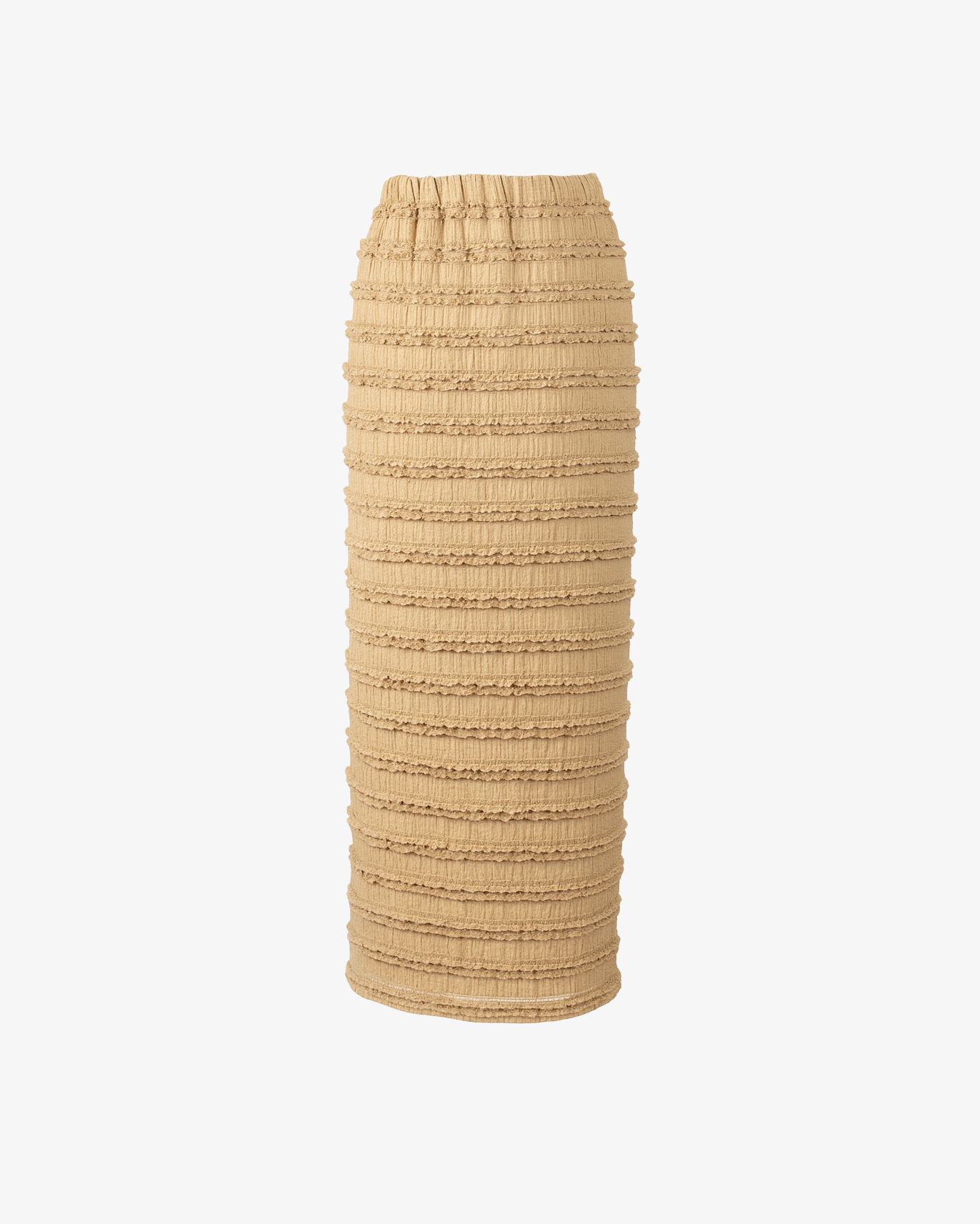 Gonna longuette a tubino in tessuto arricciato. Linea aderente e femminile, con texture a balze orizzontali che donano movimento e stile, perfetta per outfit chic e versatili.