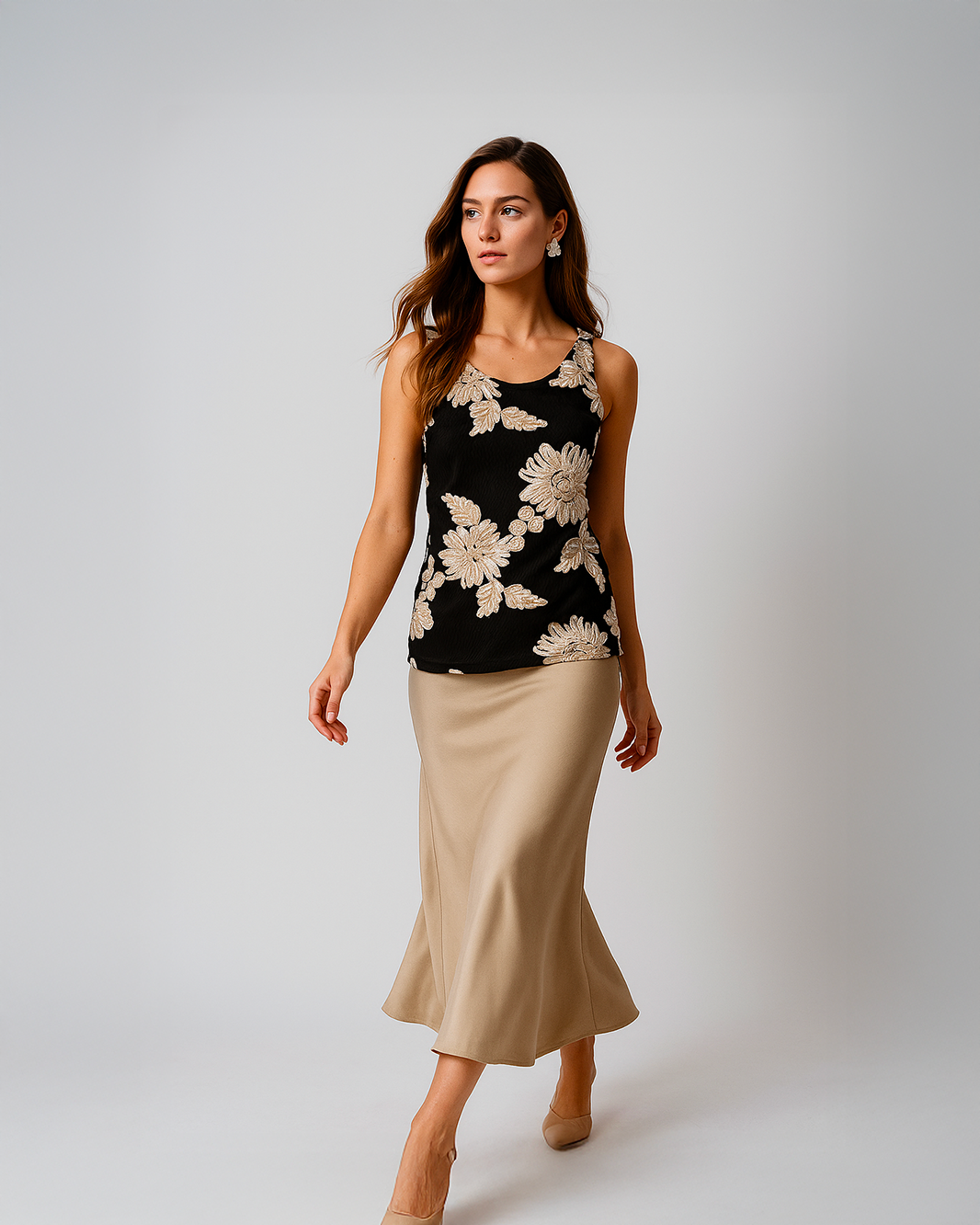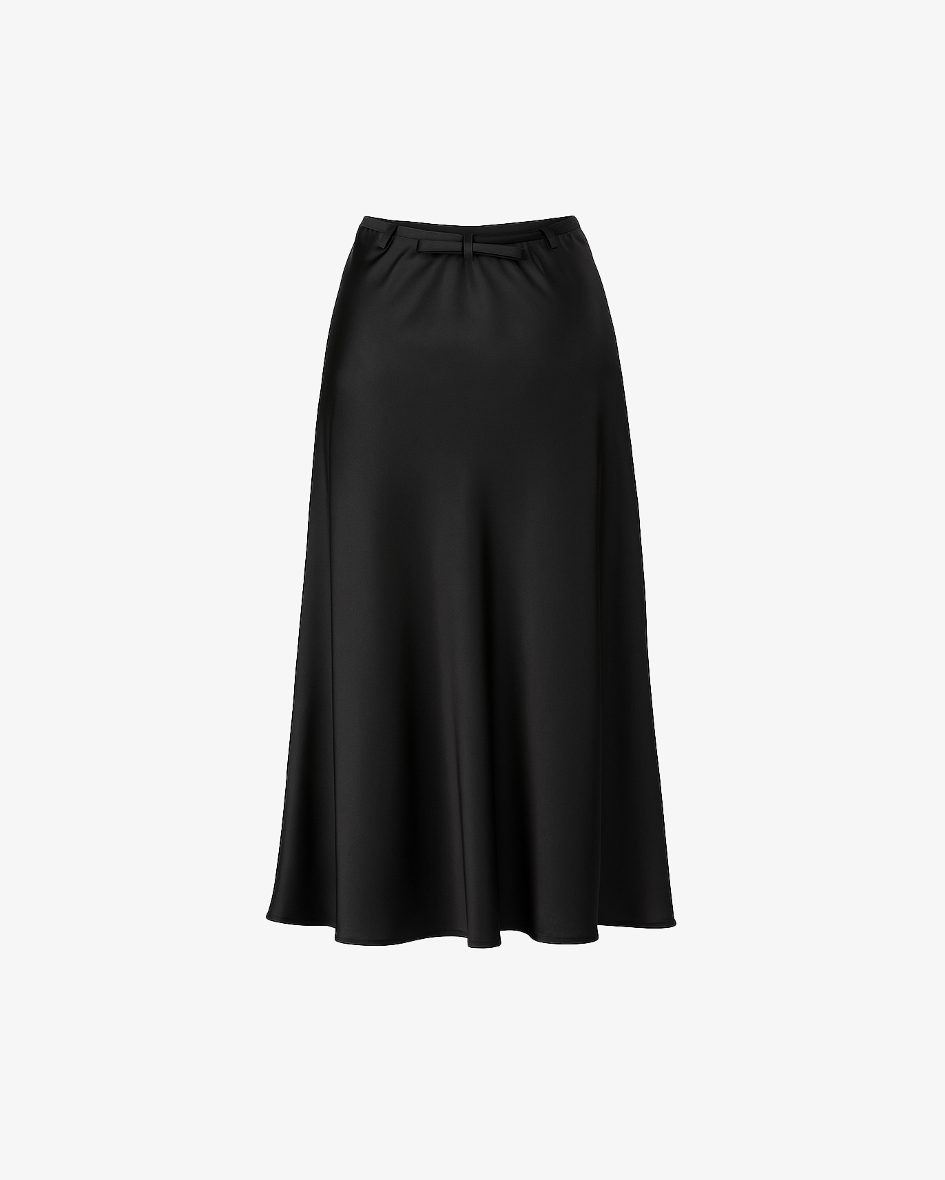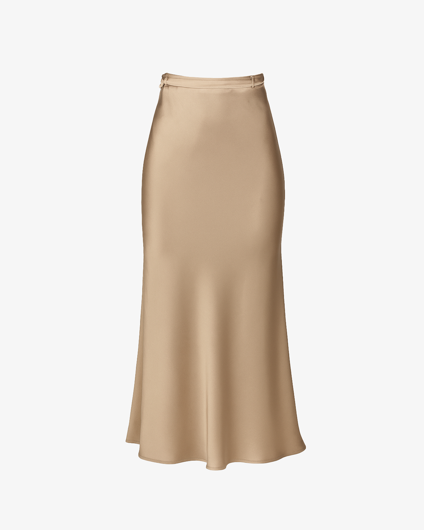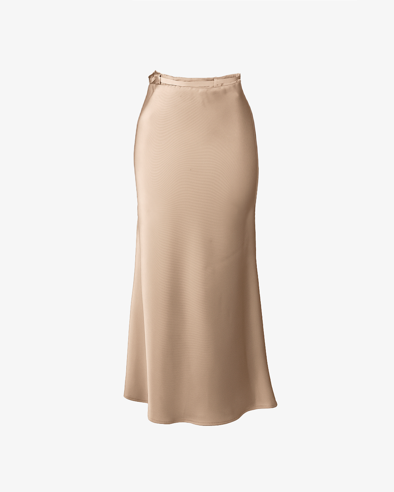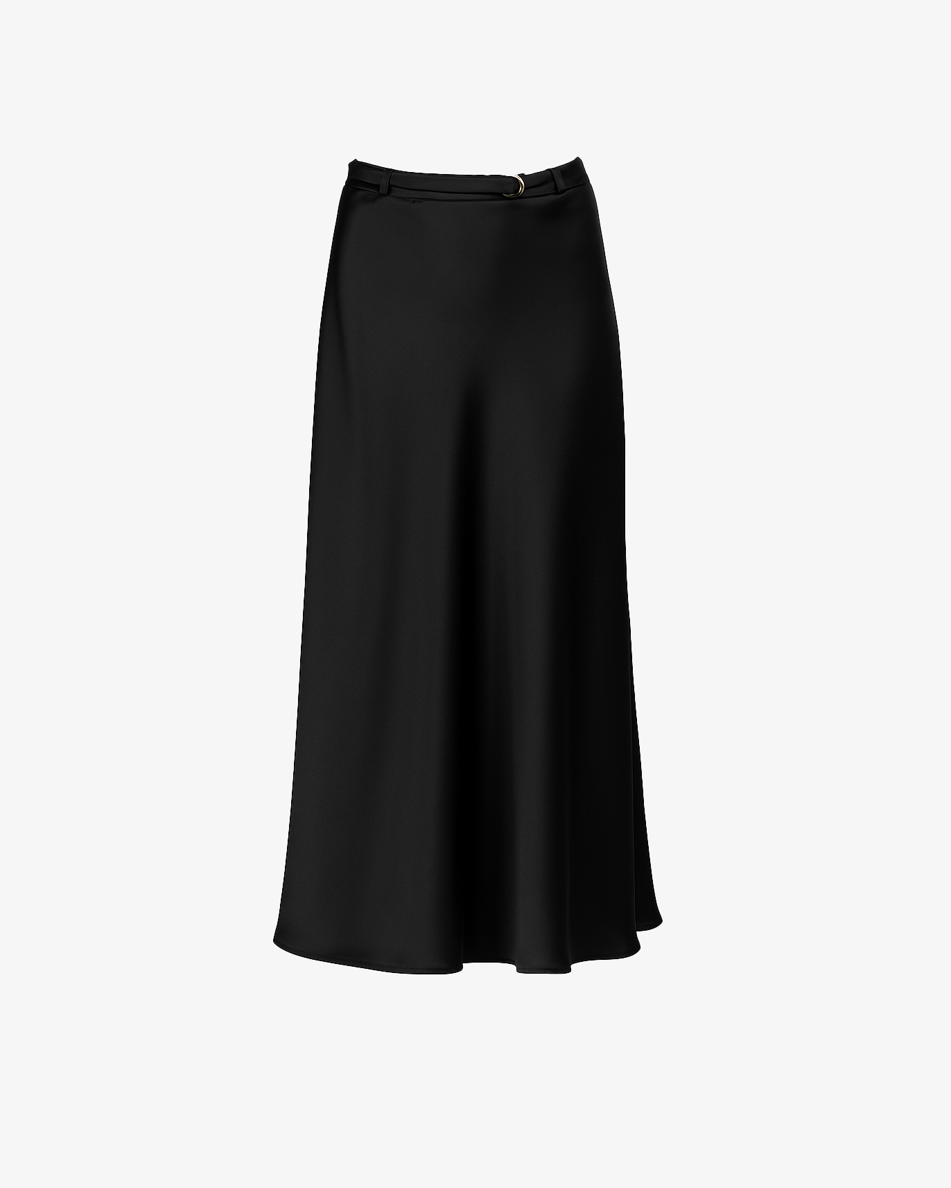 Gonna lunga satinata. Elegante e fluida, questa gonna dalla linea morbida scivola delicatamente sul corpo, garantendo comfort e femminilità. Dettagliata con cintura sottile in vita con fibbia, è un capo raffinato e versatile, ideale sia per il giorno che per la sera.