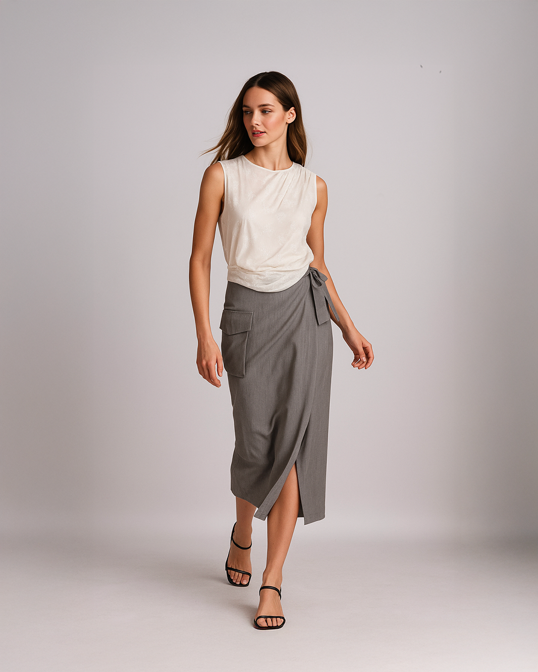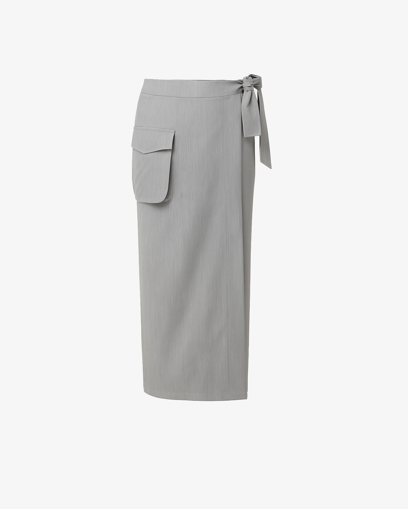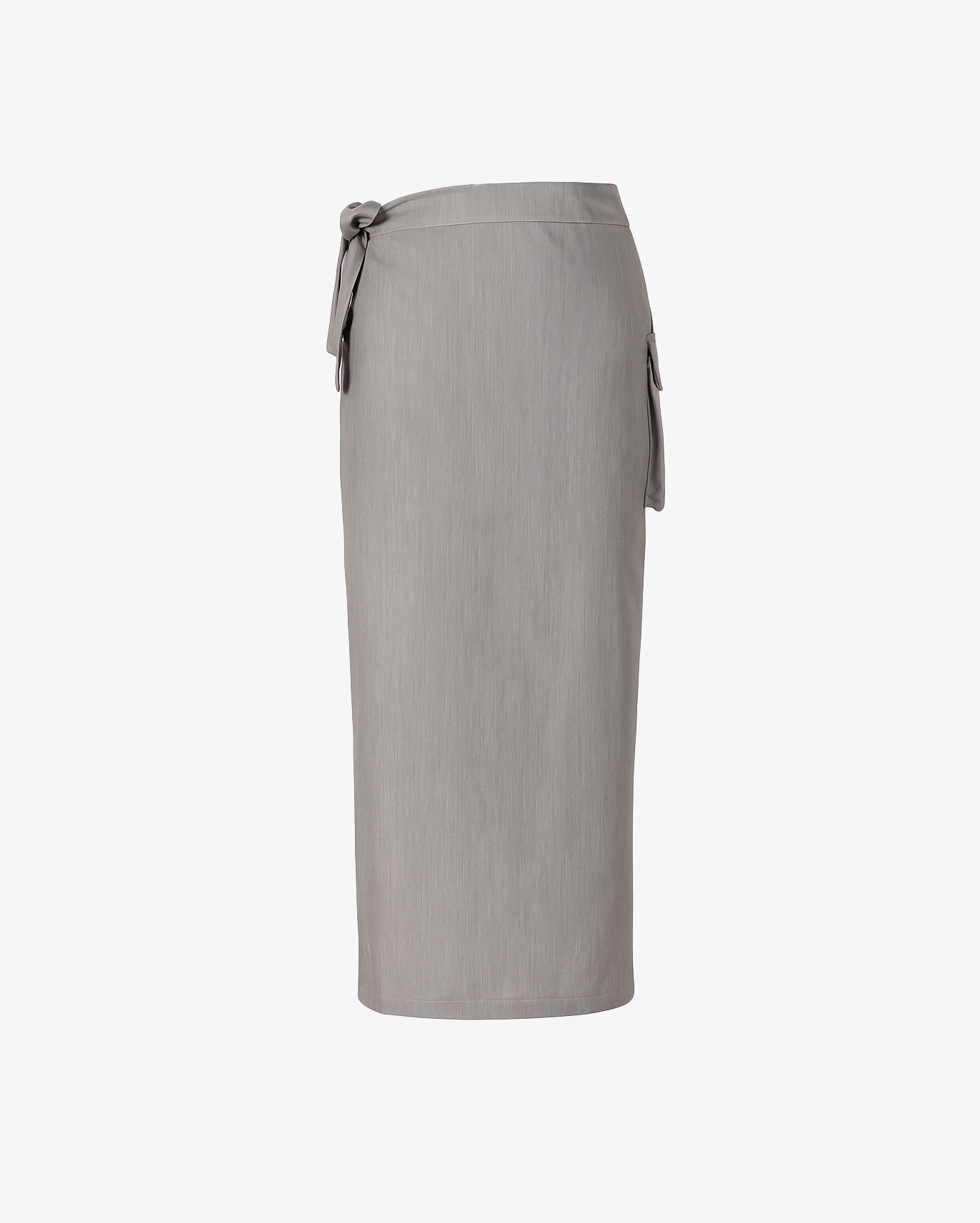 Minimal e sofisticata, questa gonna a portafoglio in tonalità grigio chiaro si distingue per il maxi tascone laterale e la chiusura con fiocco in vita. La linea dritta e pulita la rende un capo versatile, ideale per look urbani o più formali.