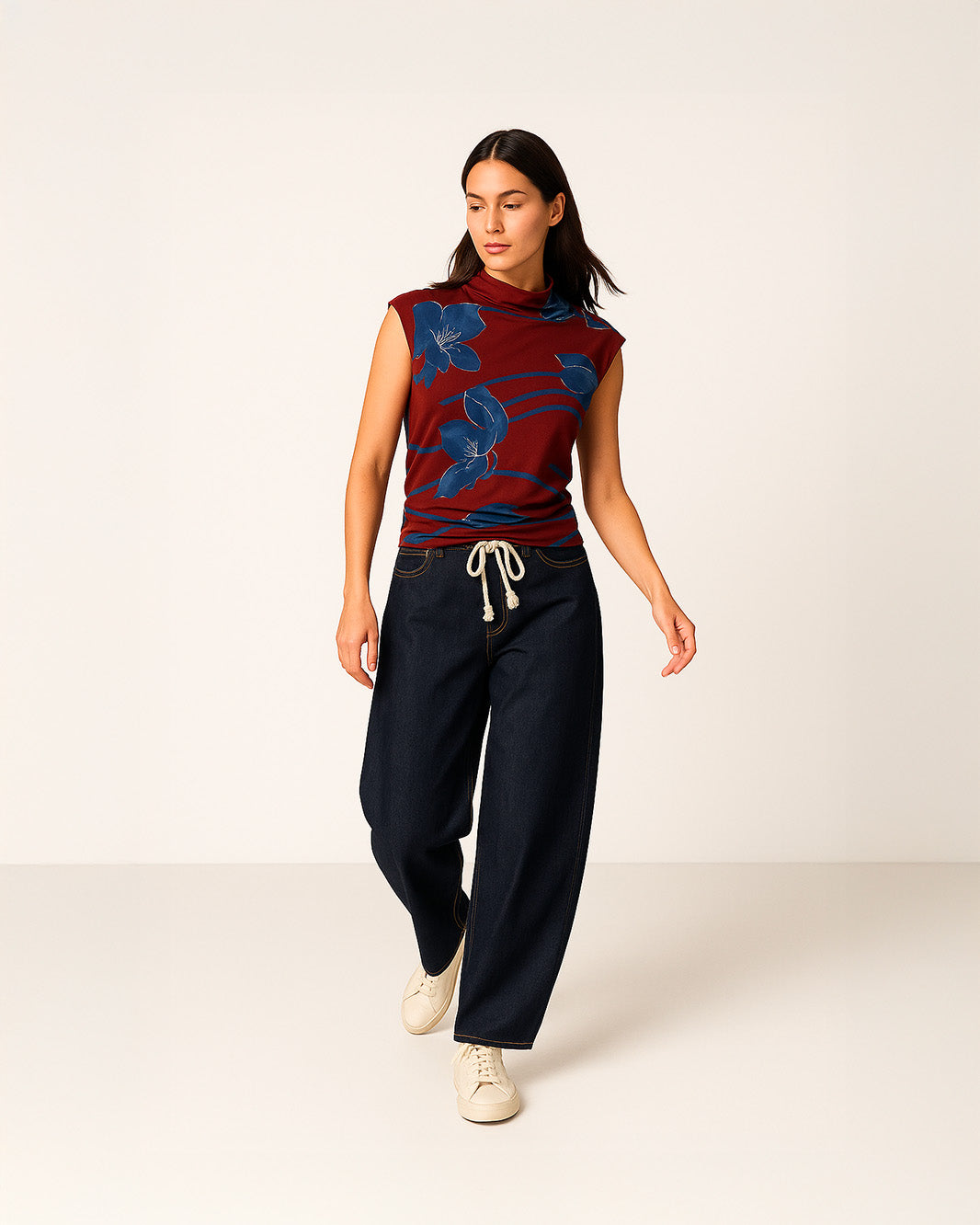 Jeans wide-leg con cintura corda. Realizzati in denim scuro, presentano una linea morbida e ampia che dona comfort e un look rilassato. Il dettaglio della cintura in corda intrecciata con nappine aggiunge un tocco naturale e boho-chic, perfetto per outfit casual ma ricercati.