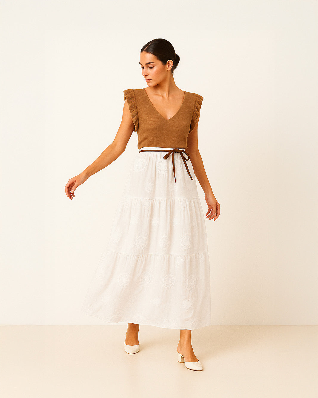 Top in maglia con scollo a V e maniche arricciate. Un modello femminile e versatile, ideale da abbinare a gonne o pantaloni per un look casual chic dal tocco sofisticato.