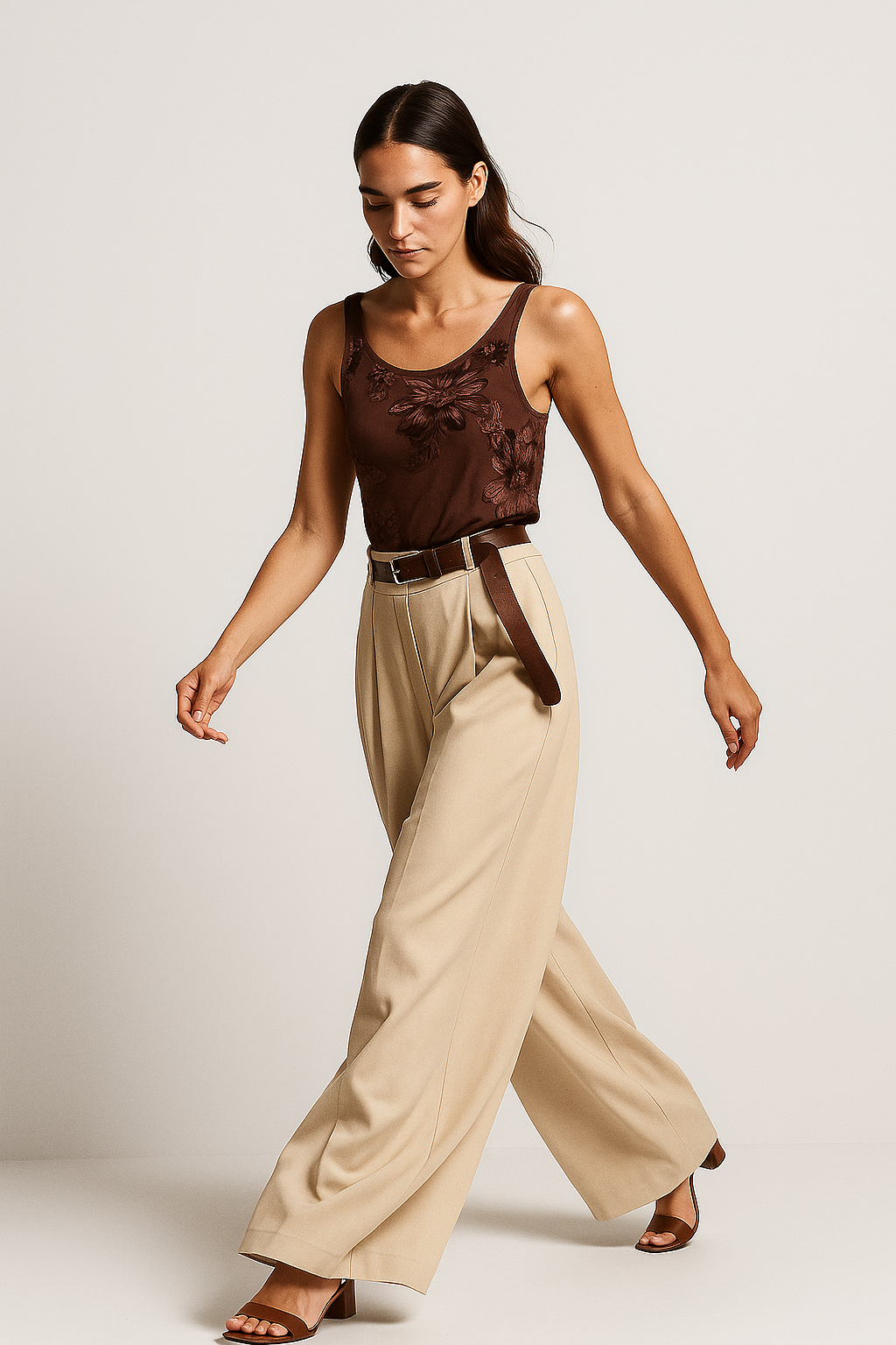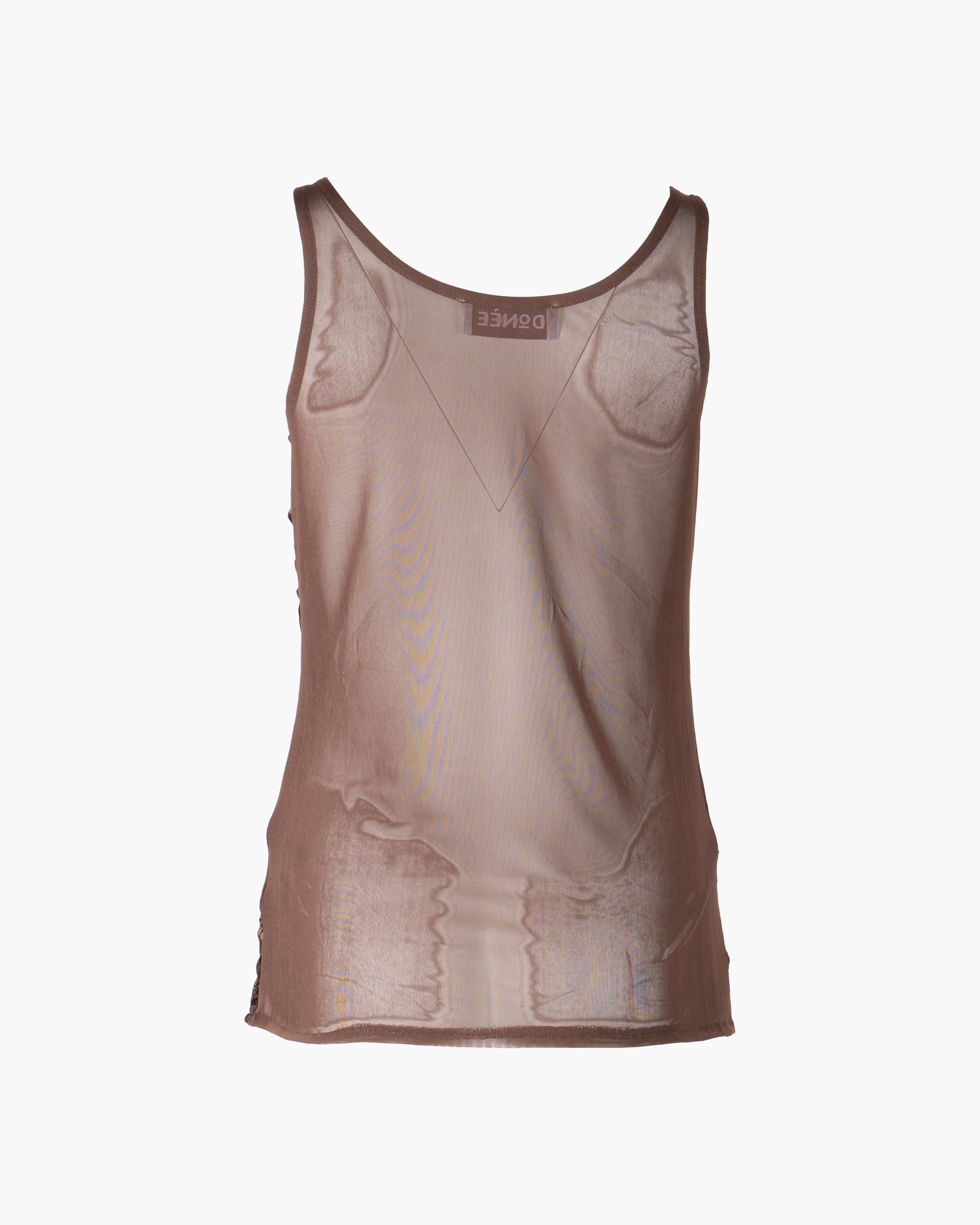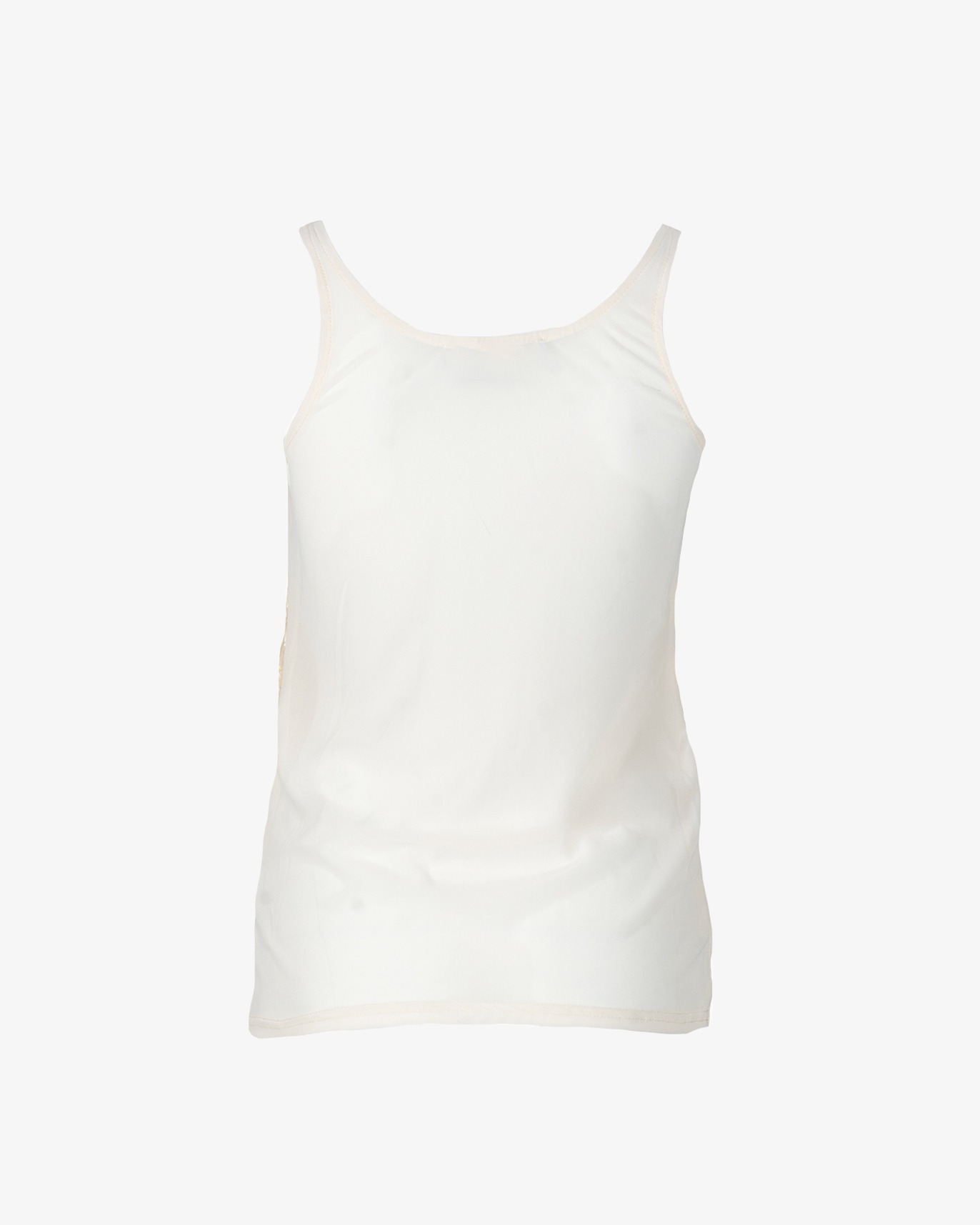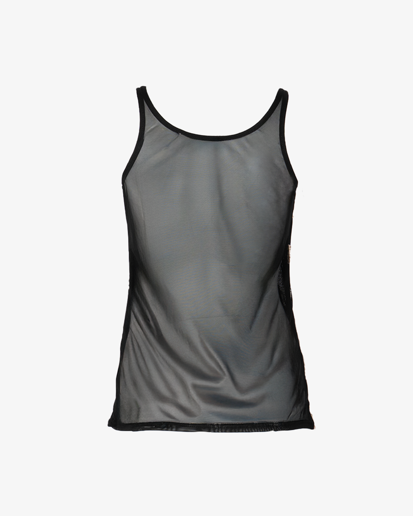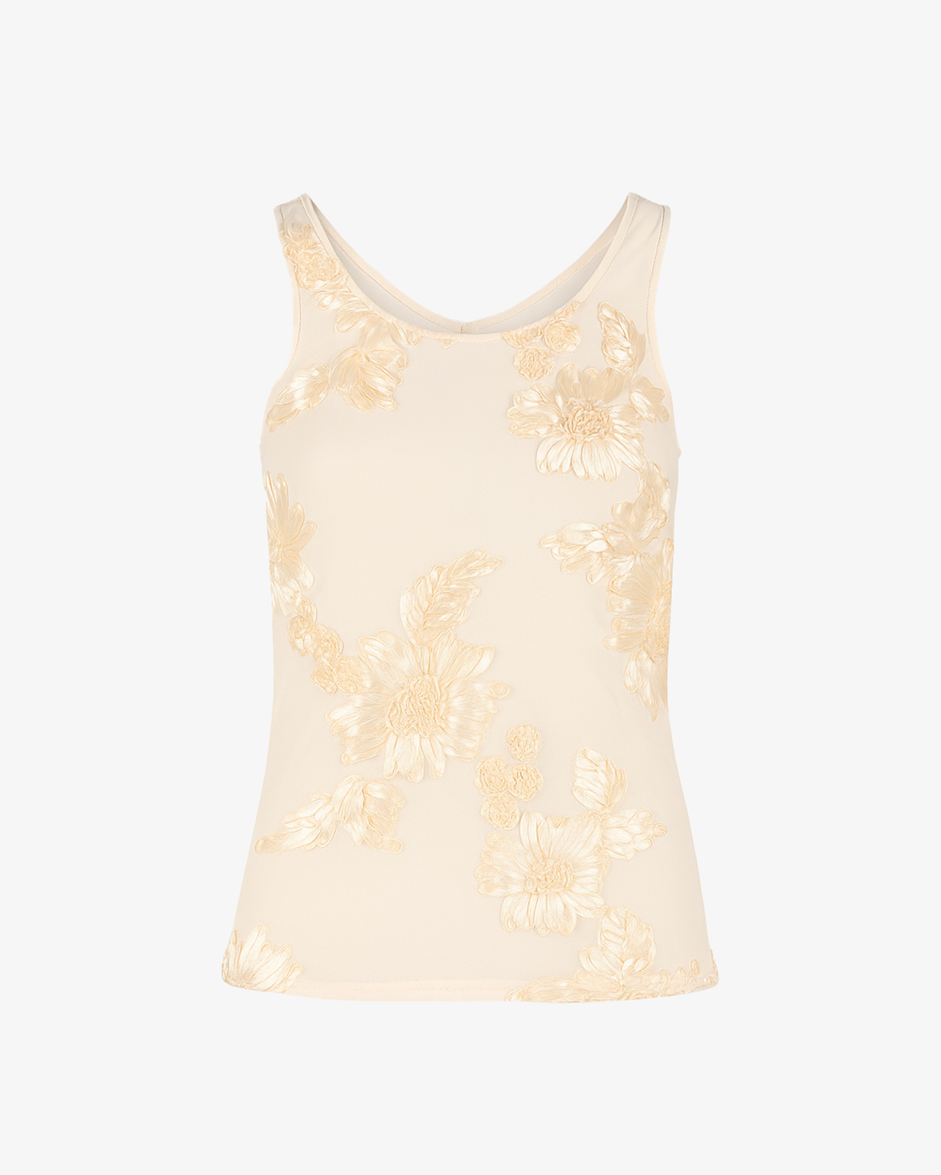 Top smanicato in tulle con ricami floreali in velluto. Un capo raffinato e femminile, perfetto da indossare sotto una giacca o da solo per un look elegante con un tocco sensuale.