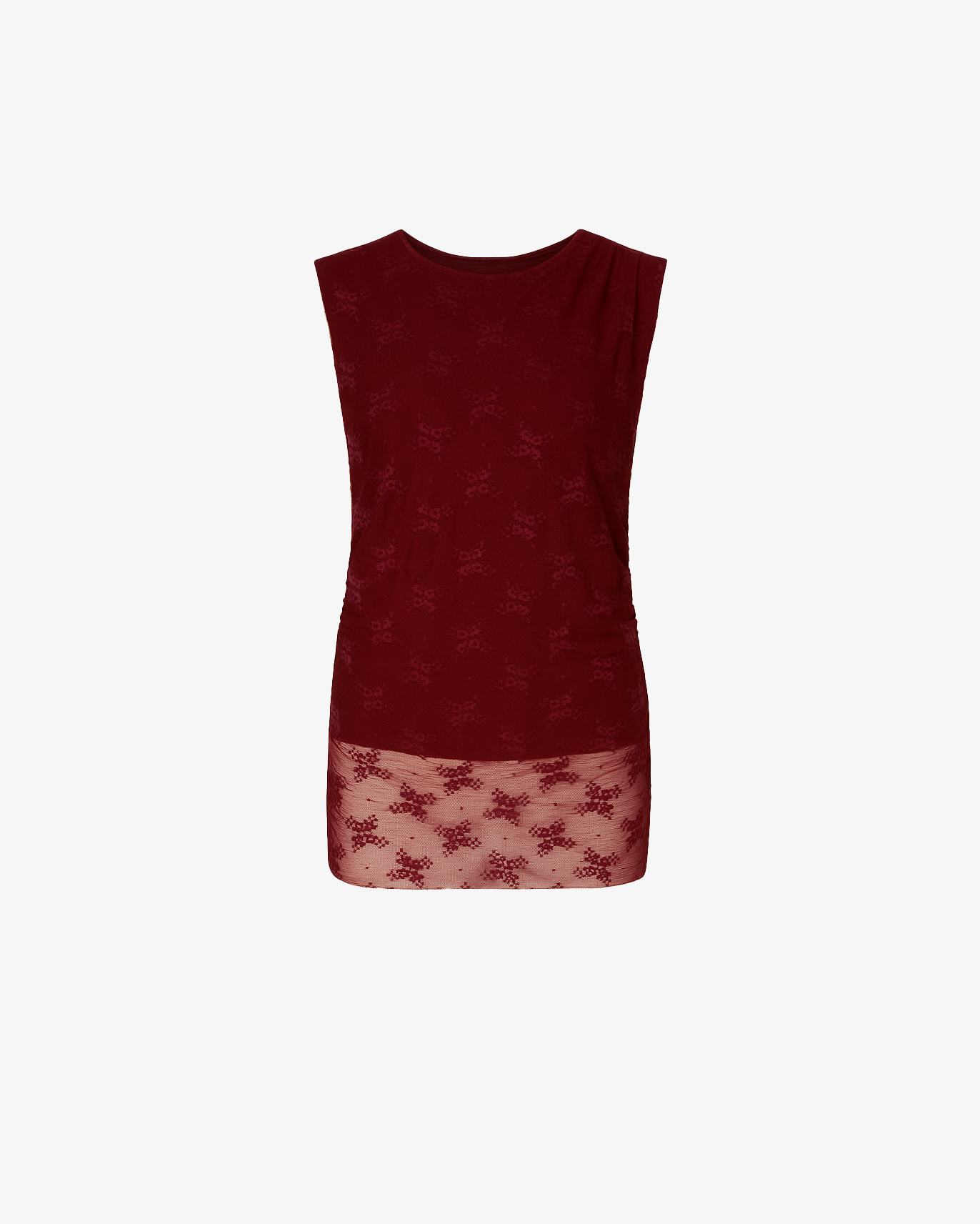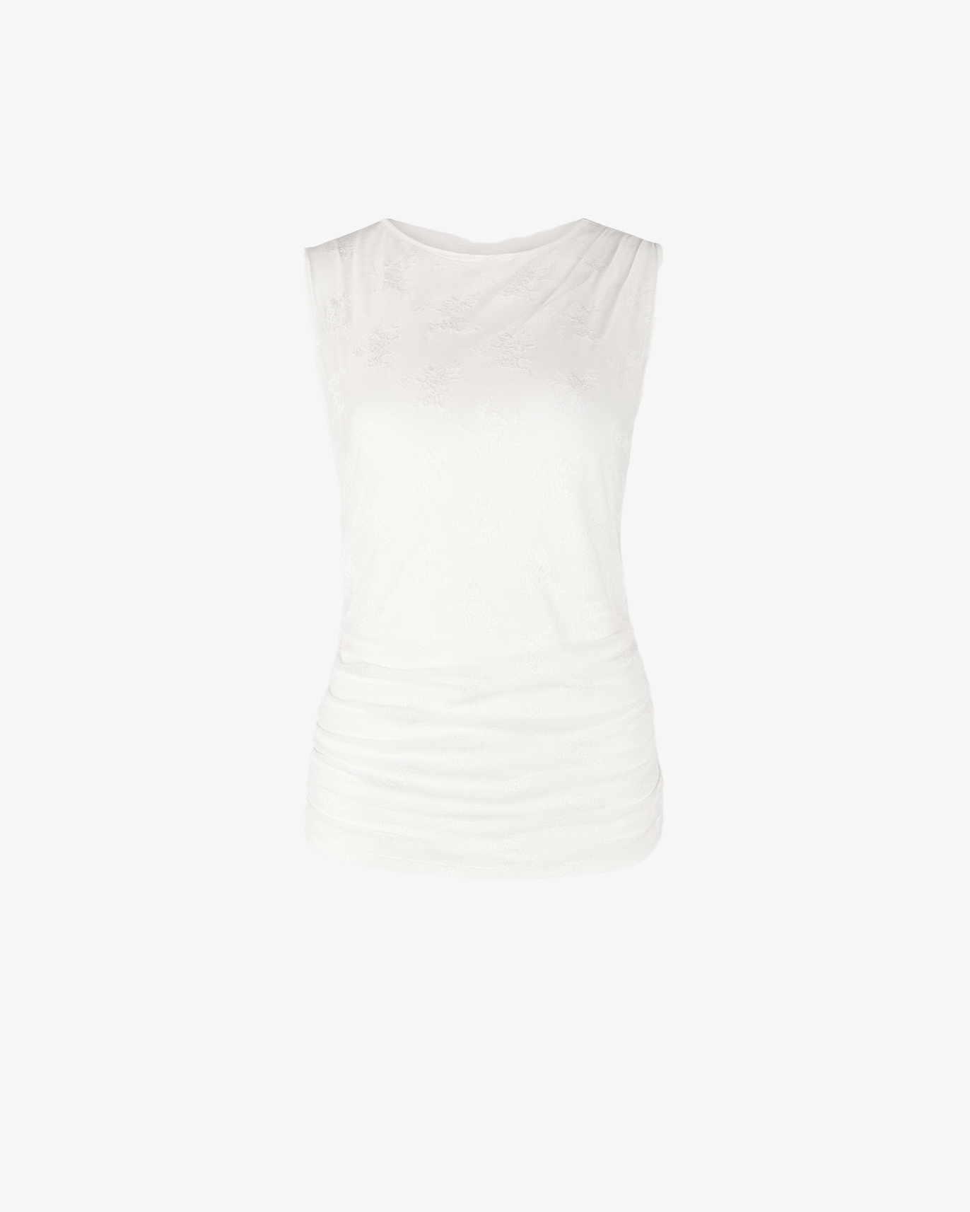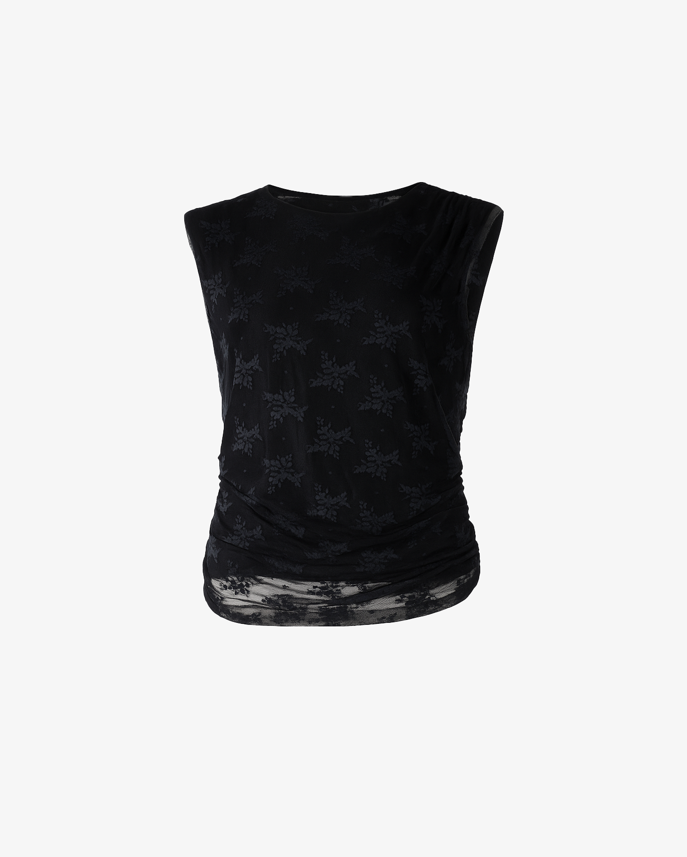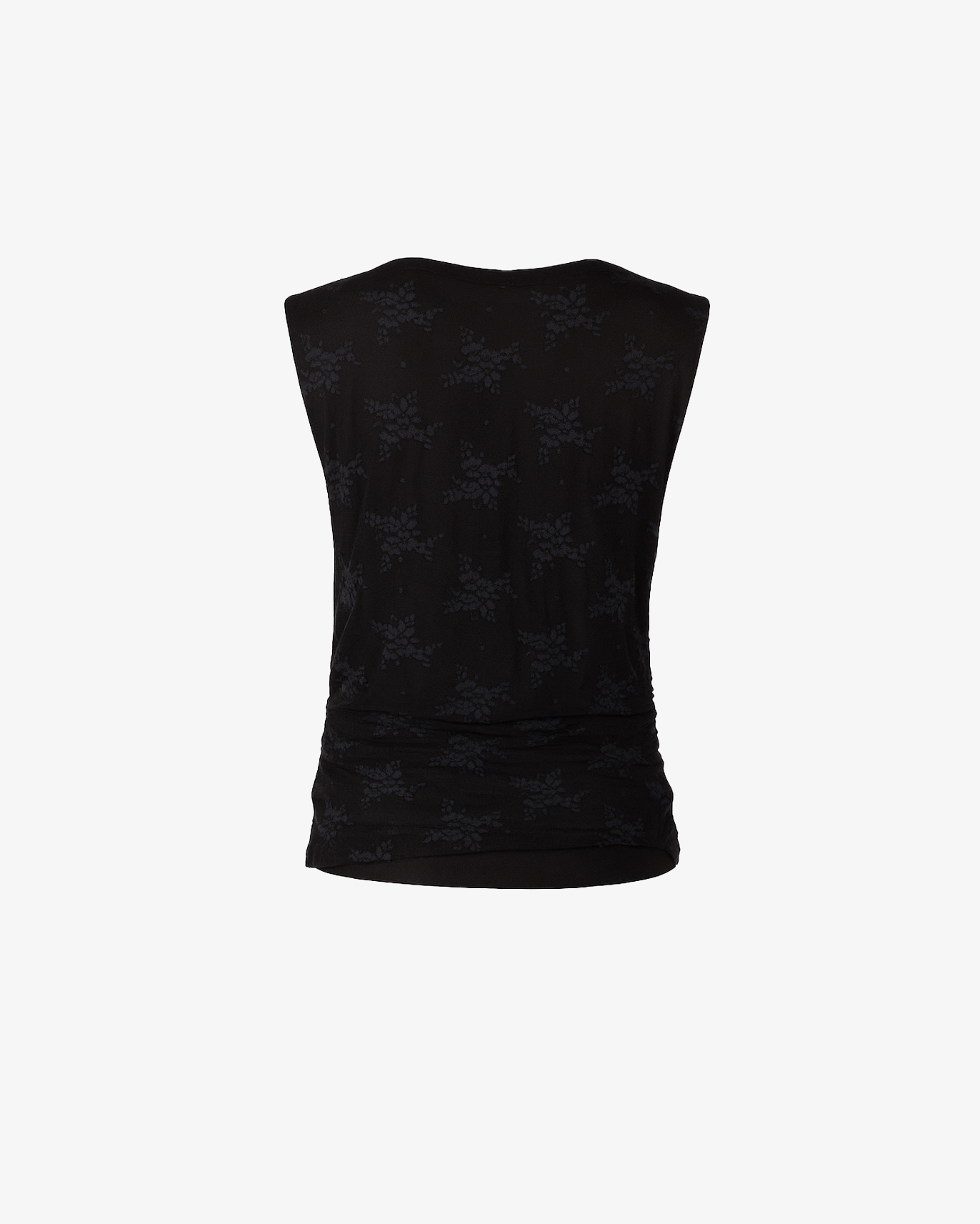 Un capo femminile e sofisticato: questo top smanicato si distingue per la texture semitrasparente e il motivo floreale tono su tono. Le leggere arricciature laterali donano movimento e valorizzano la silhouette, rendendolo ideale per look eleganti ma moderni.
